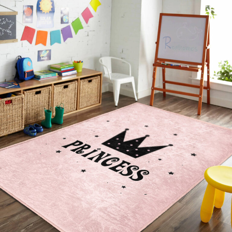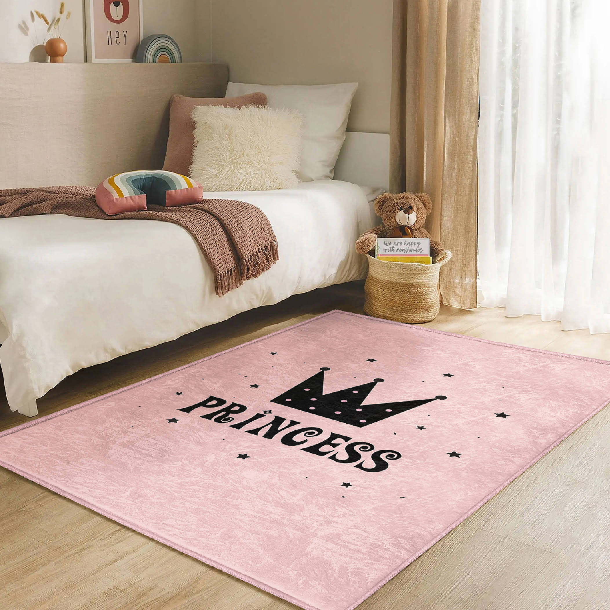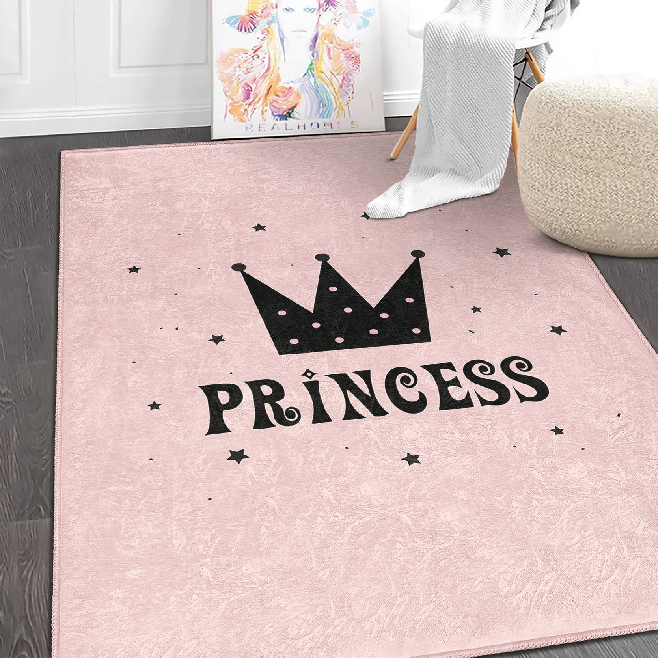 Pembe Arka Planda Siyah Prenses Taçlı Desenli Dikdörtgen Çocuk Halısı – Yıkanabilir Kaymaz Tabanlı