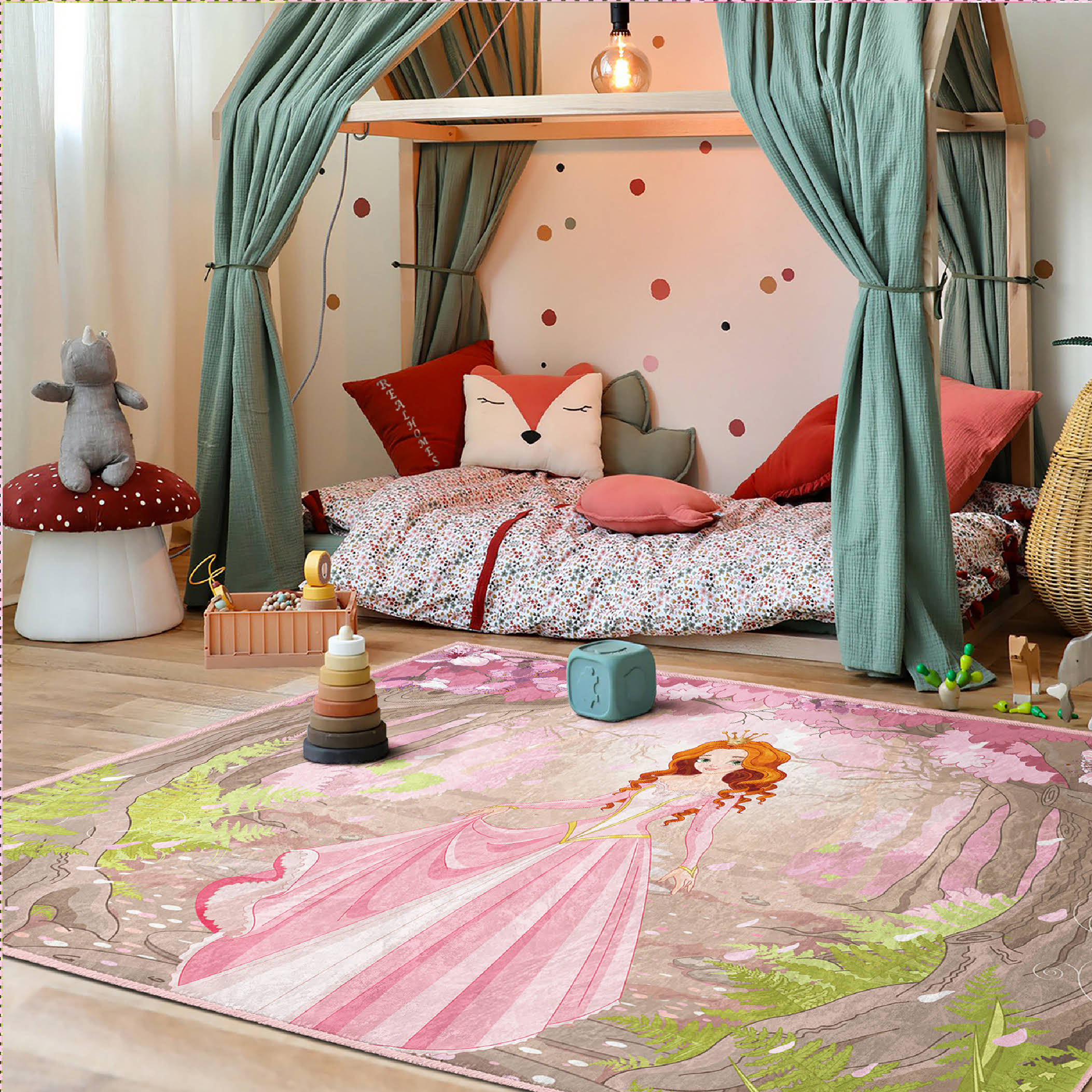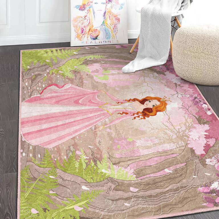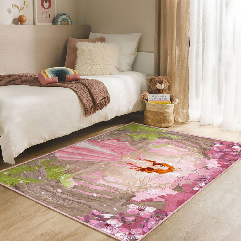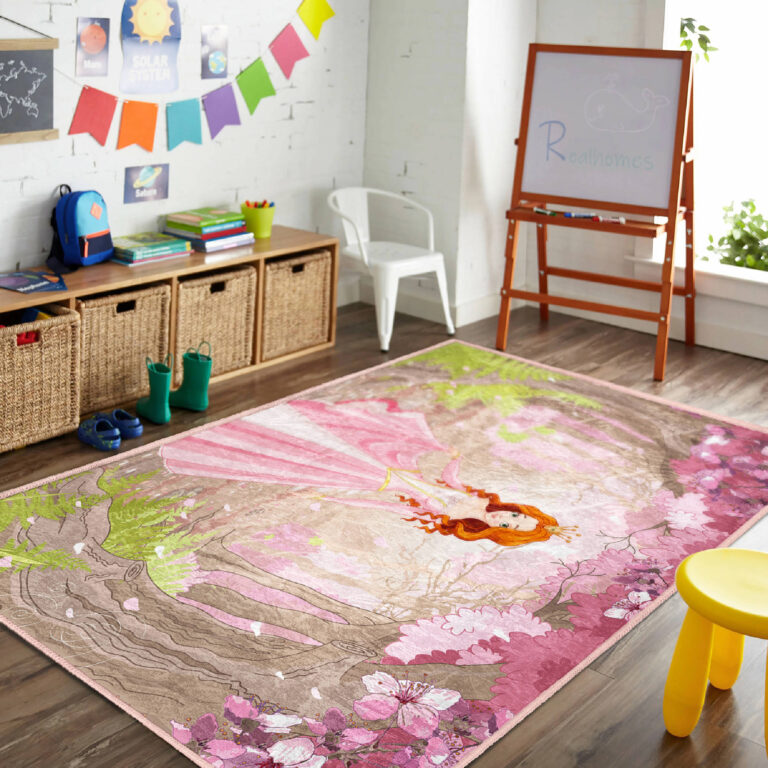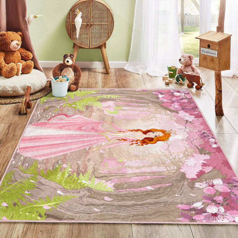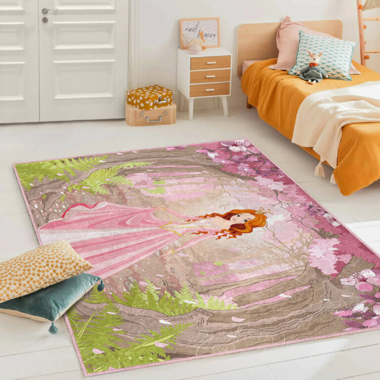 Pembe – Beyaz Çiçekli Prenses Desenli Yıkanabilir Kaymaz Taban Çocuk Halısı