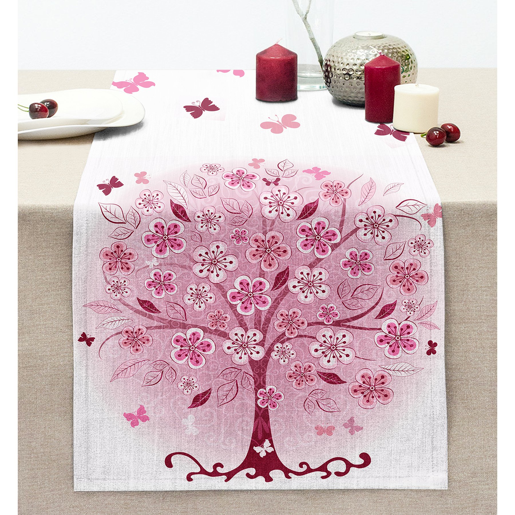 Pembe Çiçekli Ağaç Temalı Dijital Baskılı Dikişli Şönil Runner
