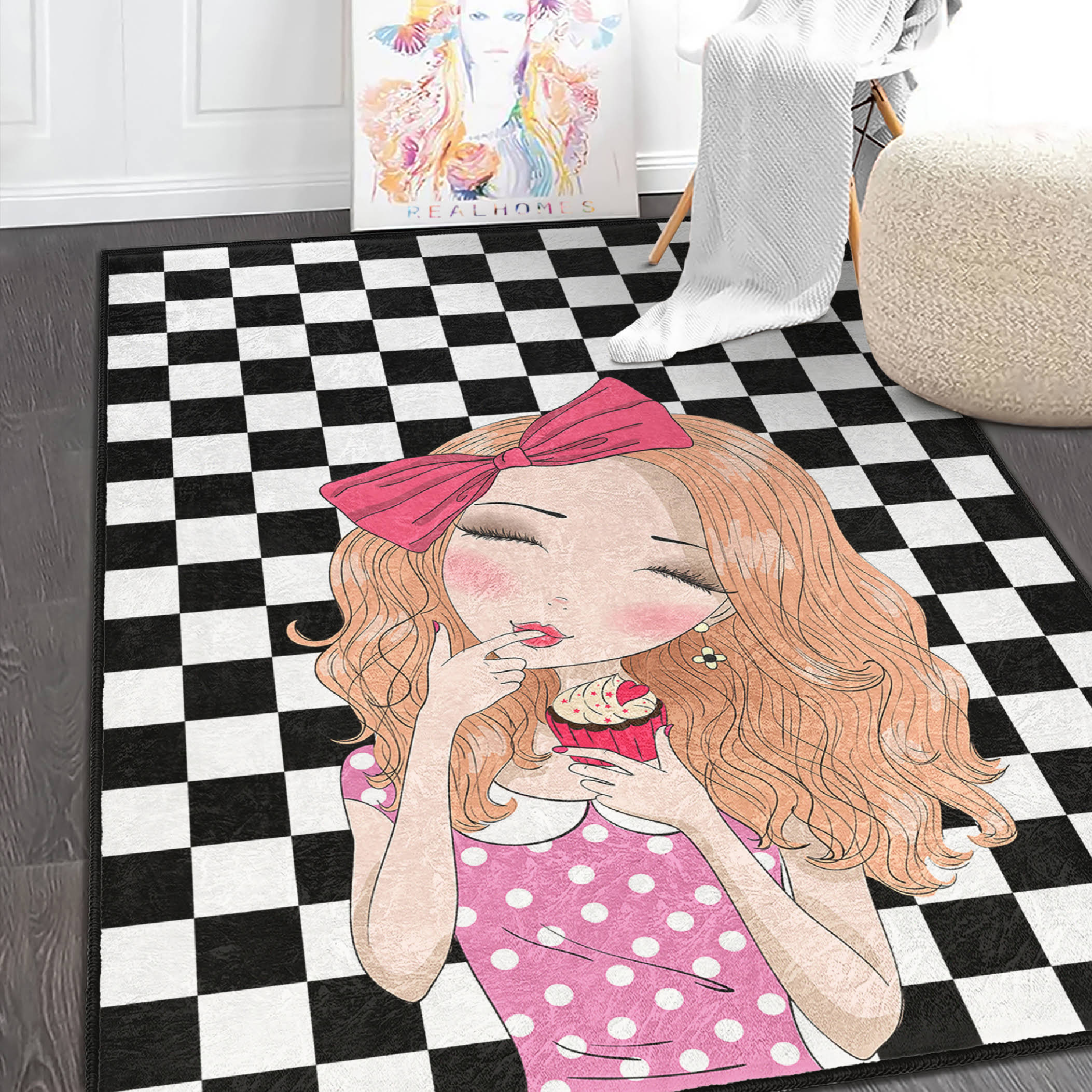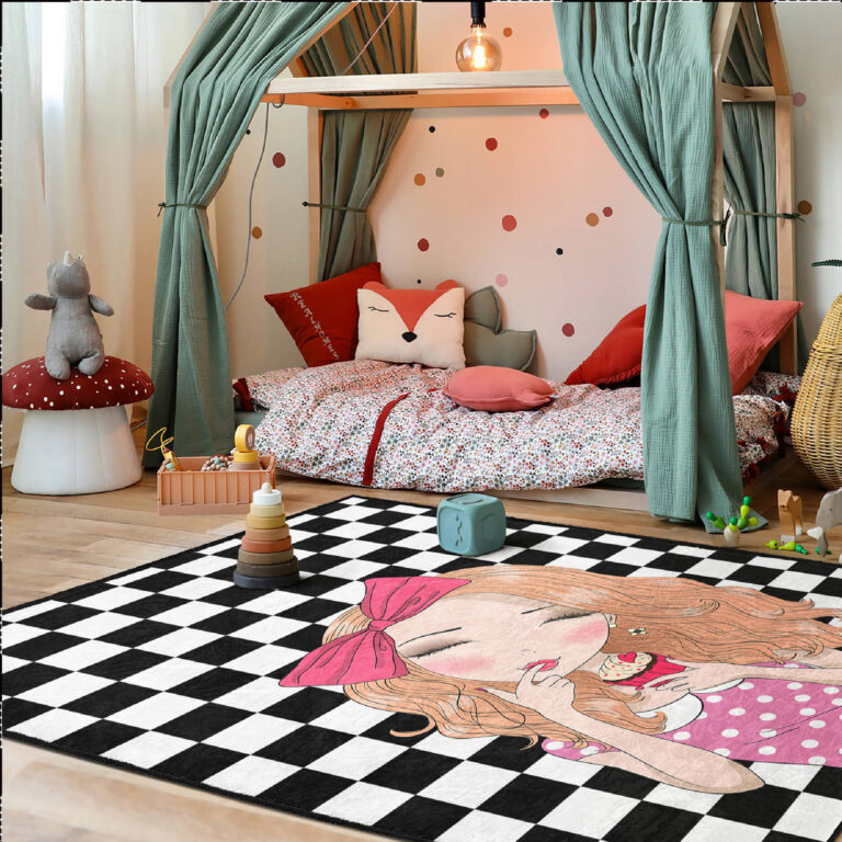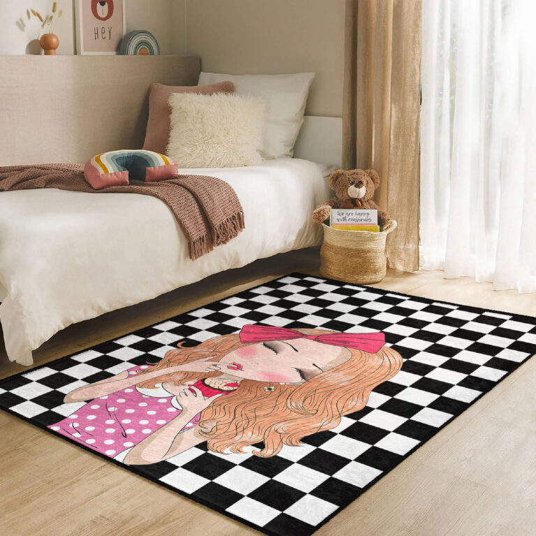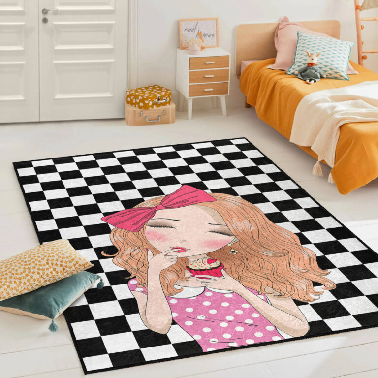 Pembe Çizgili Kız Motifli Yumuşak Desenli Dikdörtgen Çocuk Halısı – Kaymaz Tabanlı ve Makinede Yıkanabilir