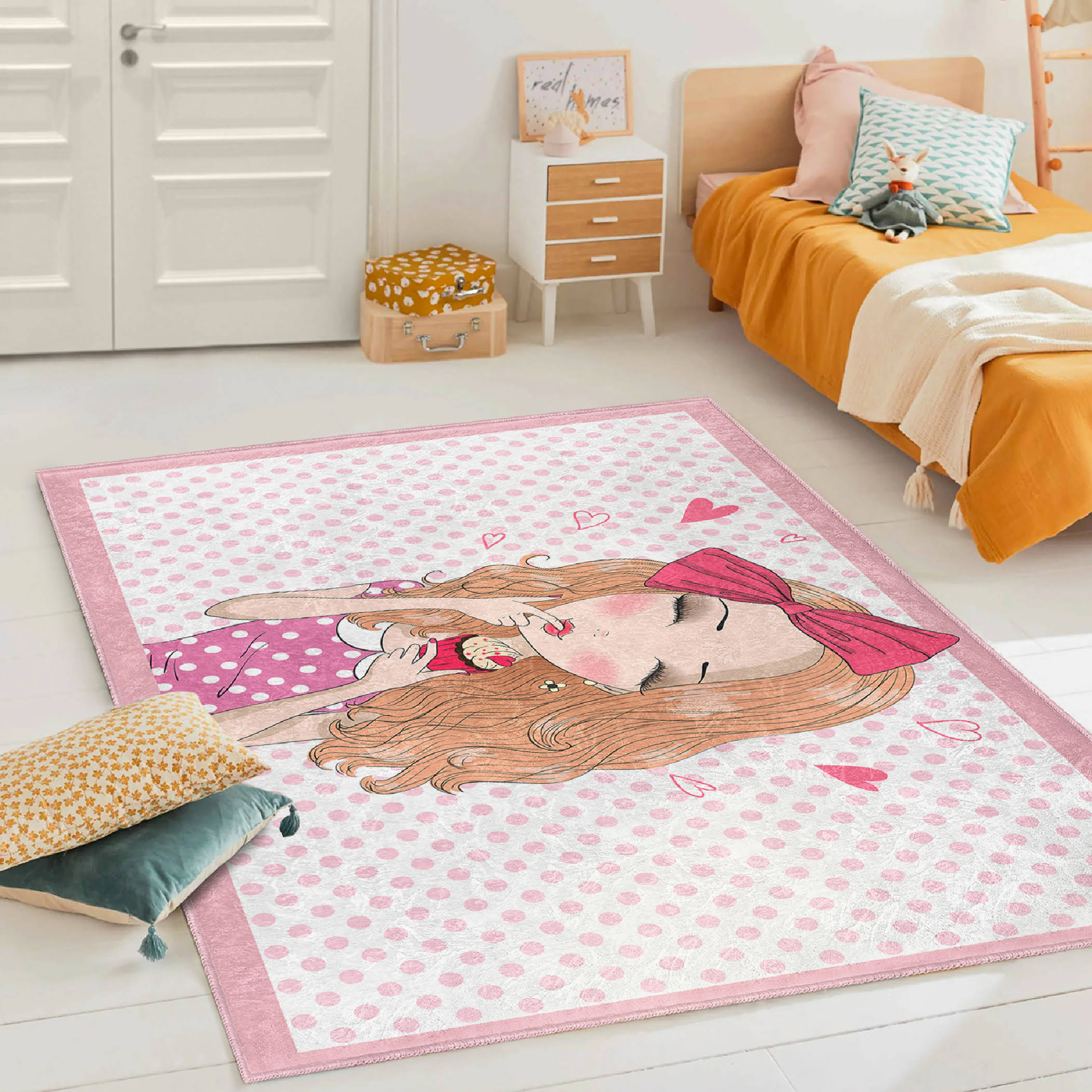 Pembe Dots – Şirin Kız Desenli Yıkanabilir Kaymaz Taban Çocuk Halısı ile Renkli Oyun Alanları