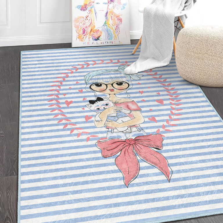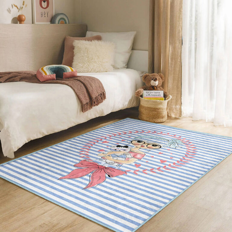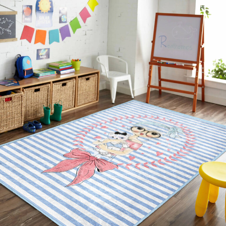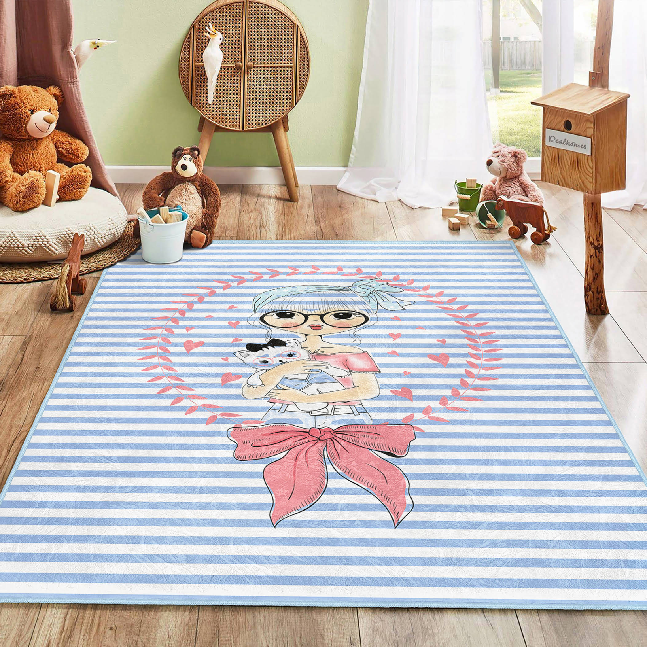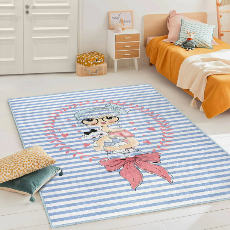 Pembe Düğüm Bows Desenli Mavi Çizgili Çocuk Odası İçin Yıkanabilir Kaymaz Taban Halı