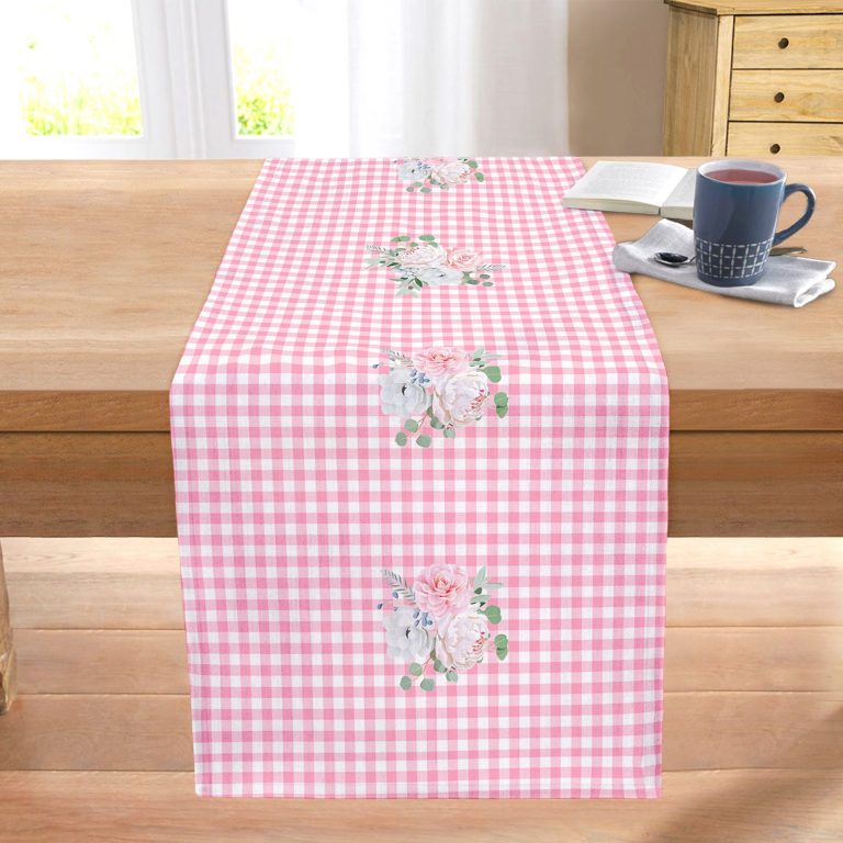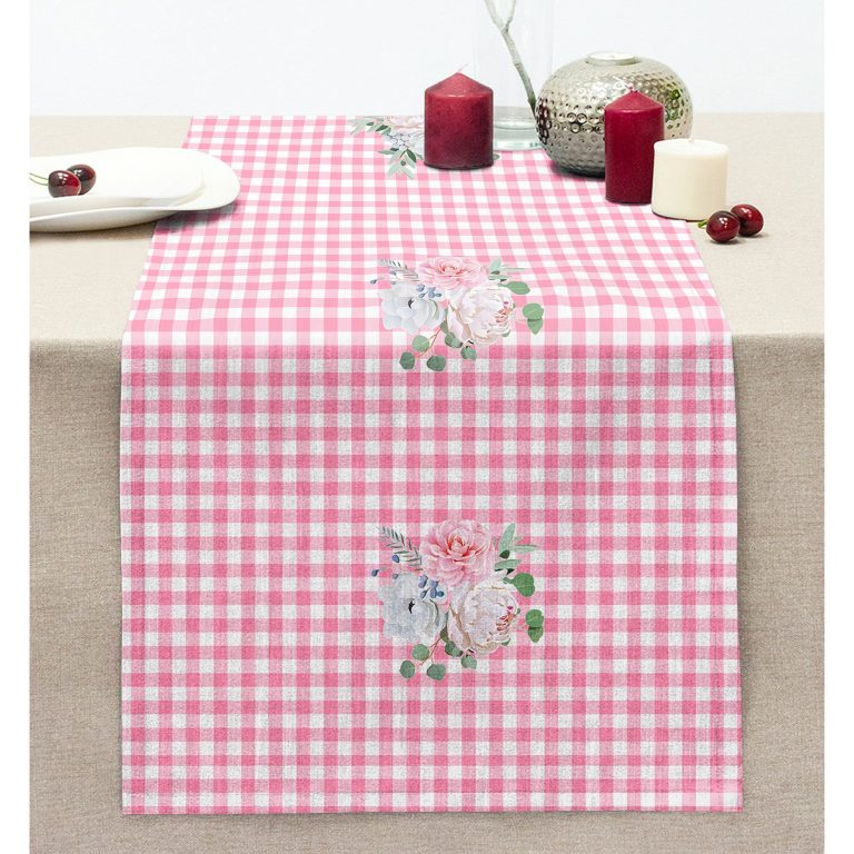 Pembe Ekose Motifli Gül Tasarımlı Modern Dikişli Şönil Runner