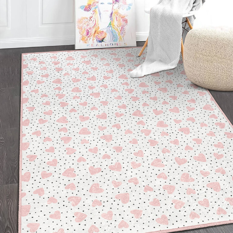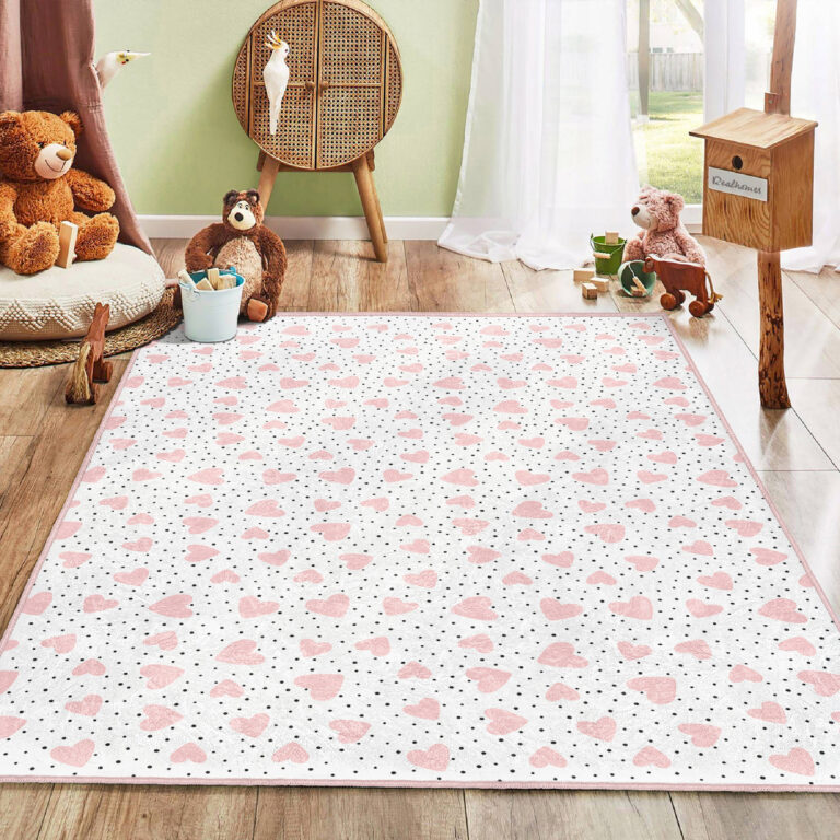 Pembe Kalp Desenli Çocuk Halısı – Kaymaz Tabanlı Makinede Yıkanabilir Yumuşak Halı