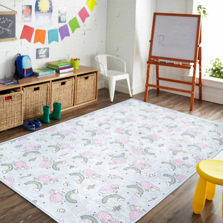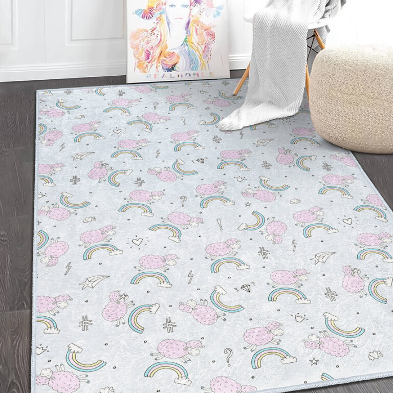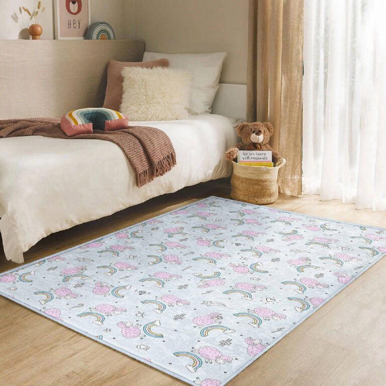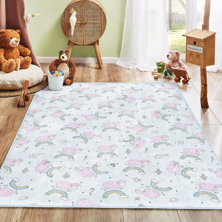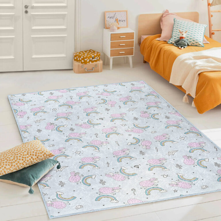Pembe Kuzu ve Gökkuşağı Desenli Renkli Dikdörtgen Çocuk Halısı – Kaymaz Tabanlı Yıkanabilir Halı