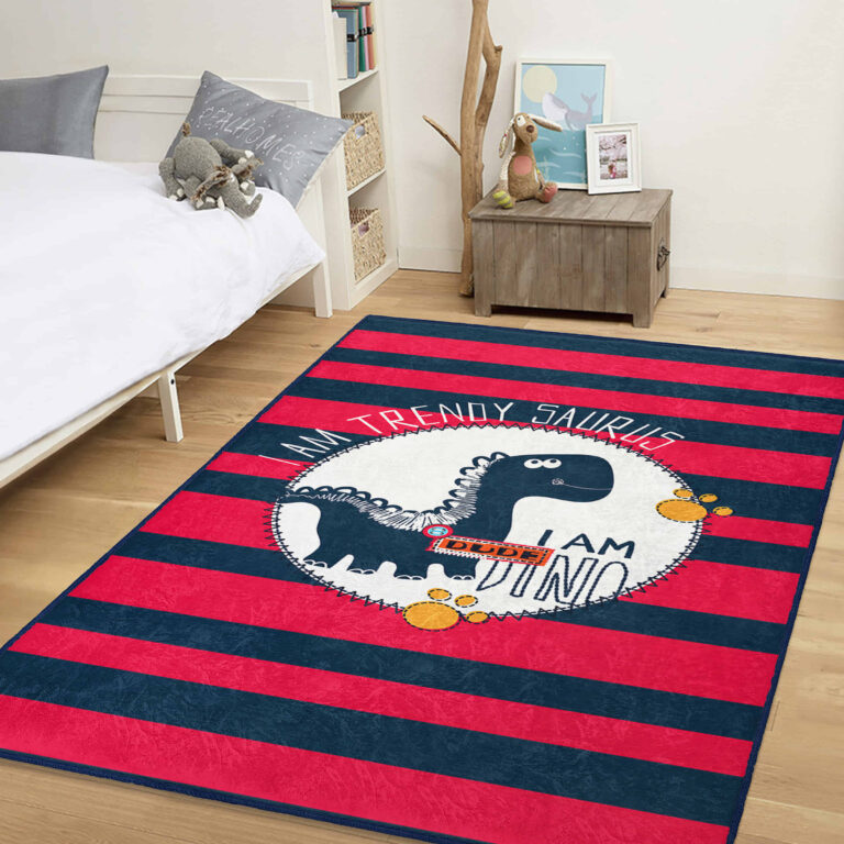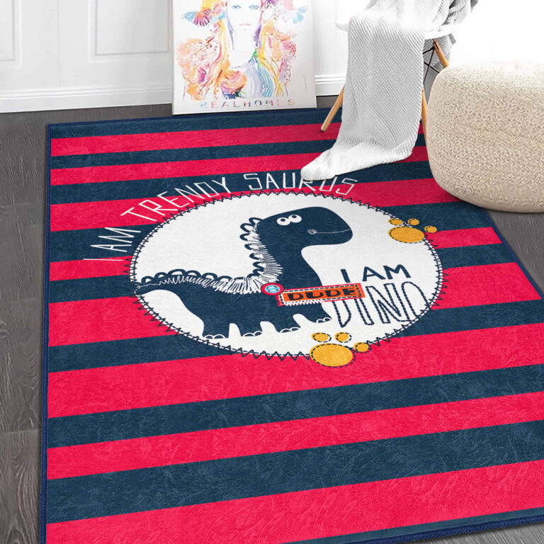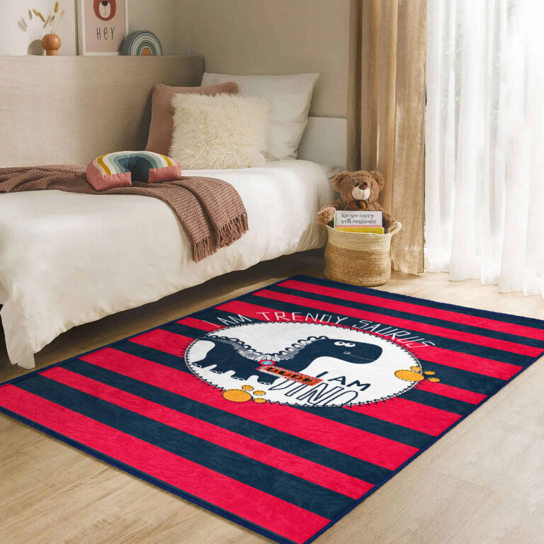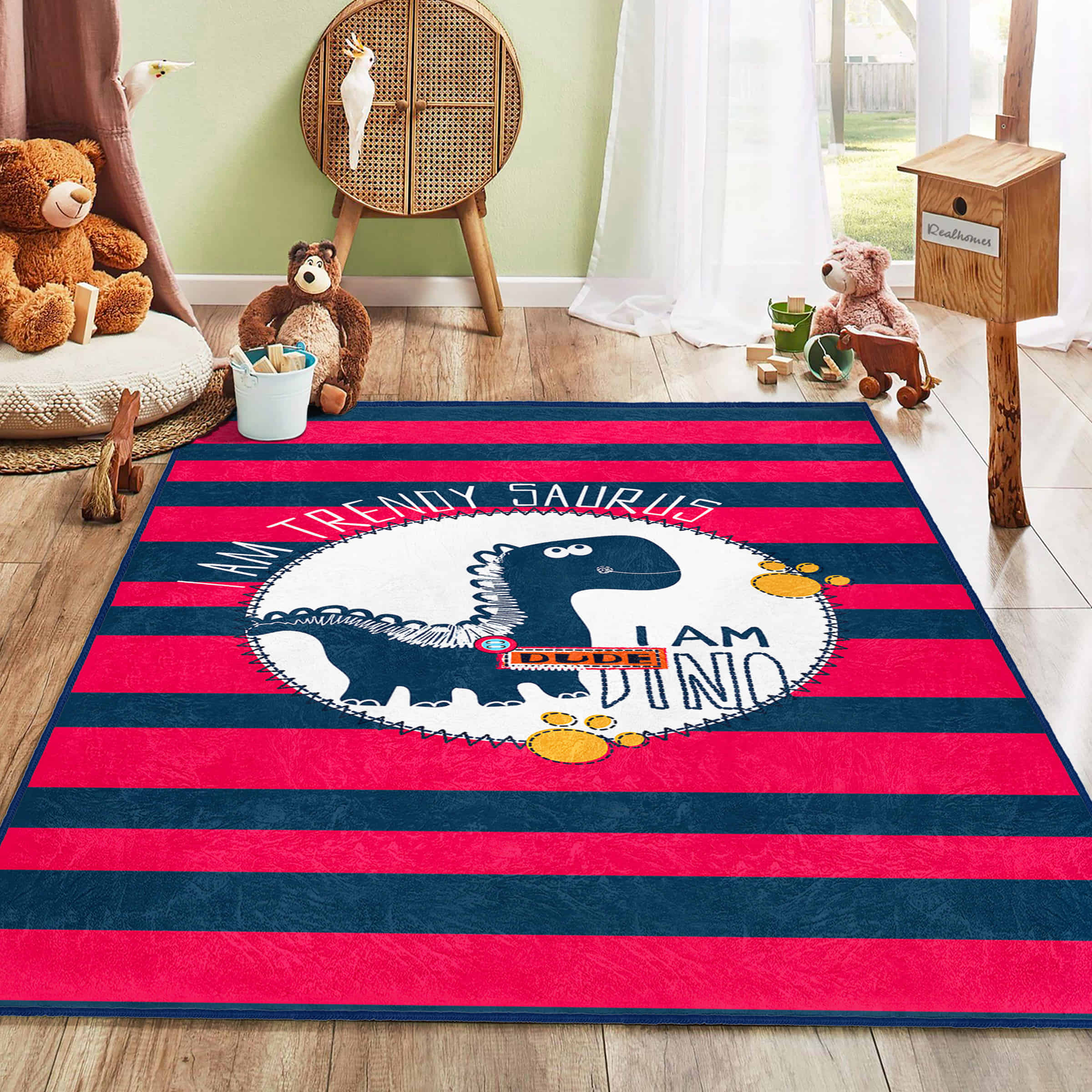 Pembe – Lacivert Şeritli Dinozor Desenli Yıkanabilir Kaymaz Taban Çocuk Halısı
