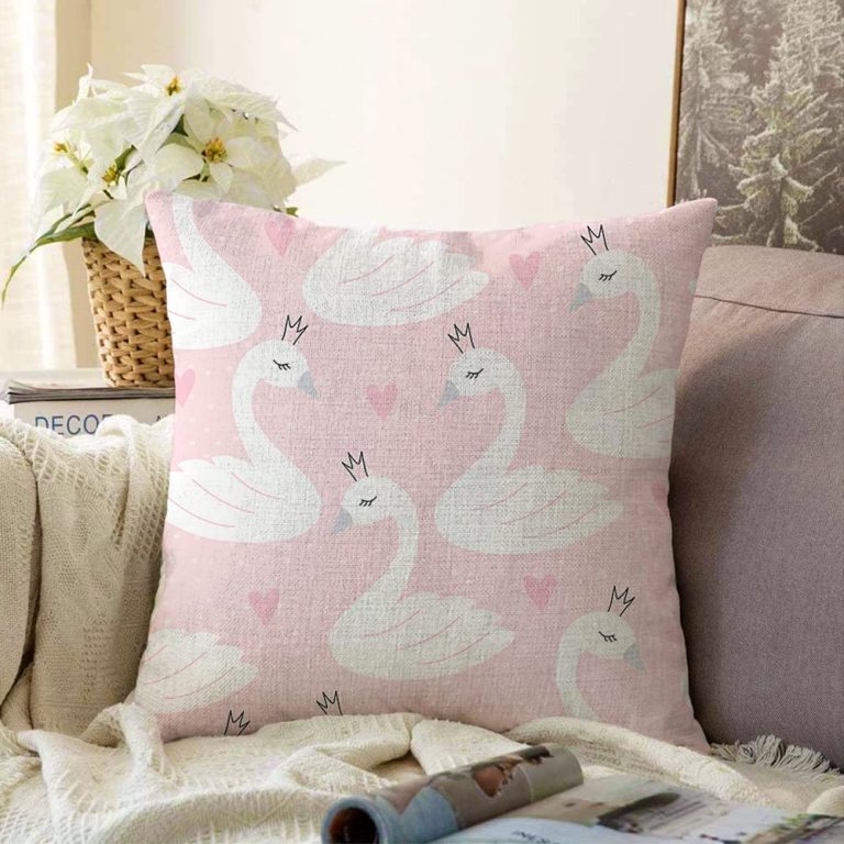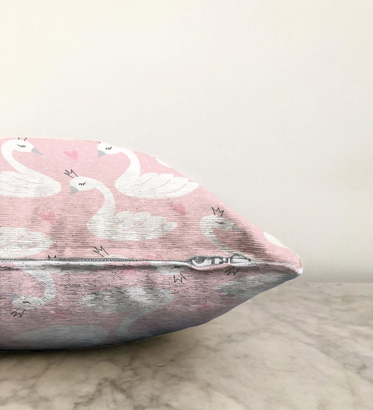 Pembe Puan Temali Kuğu Motifli Dekoratif Raşel Yastık Kırlent Kılıfı