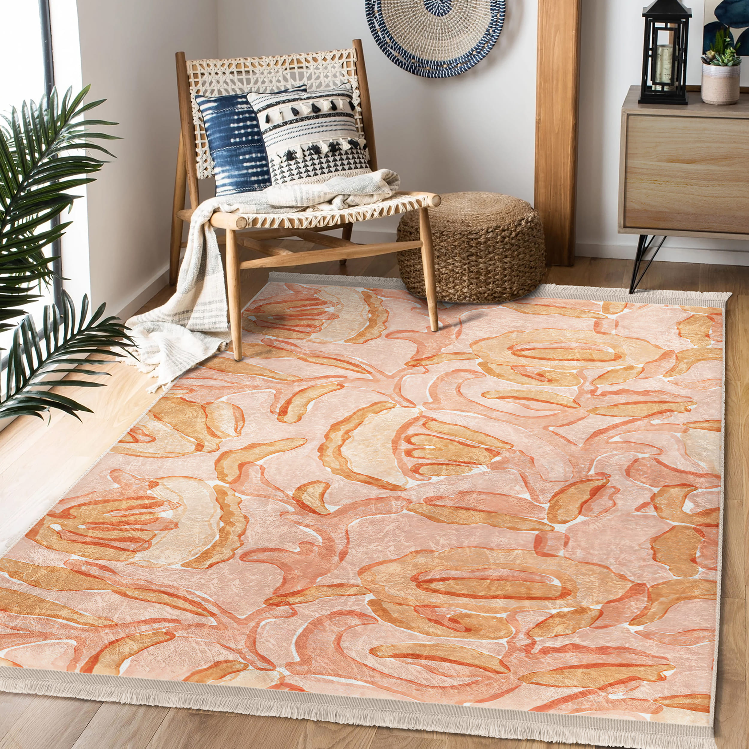 Pembe Renkli Soyut Desenli Yıkanabilir Kaymaz Taban Salon Halısı – Dikdörtgen Şekilde Modern Tasarım