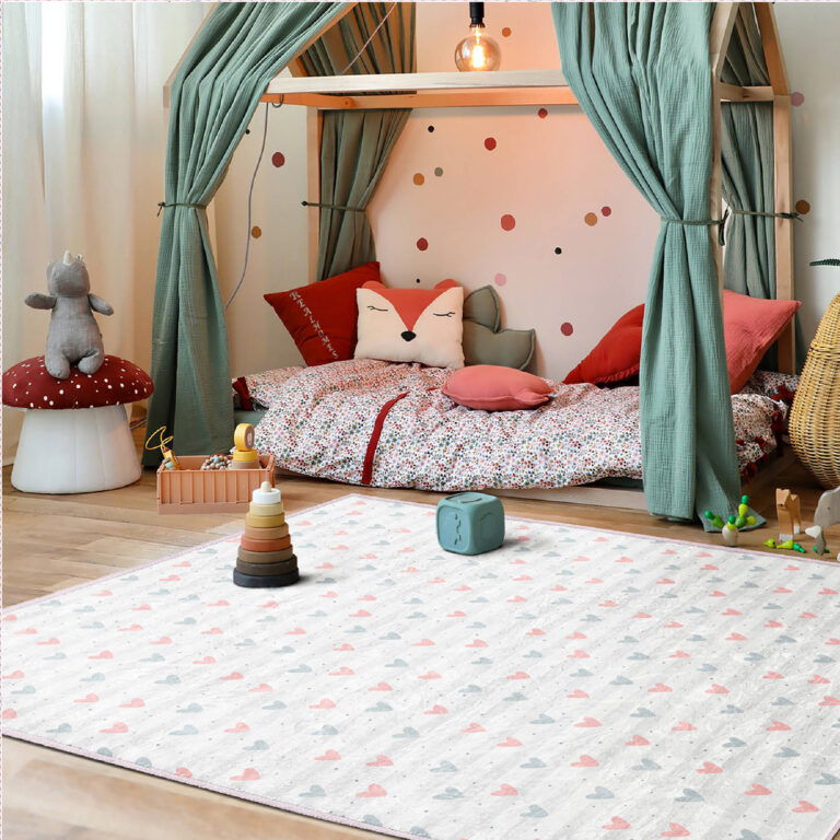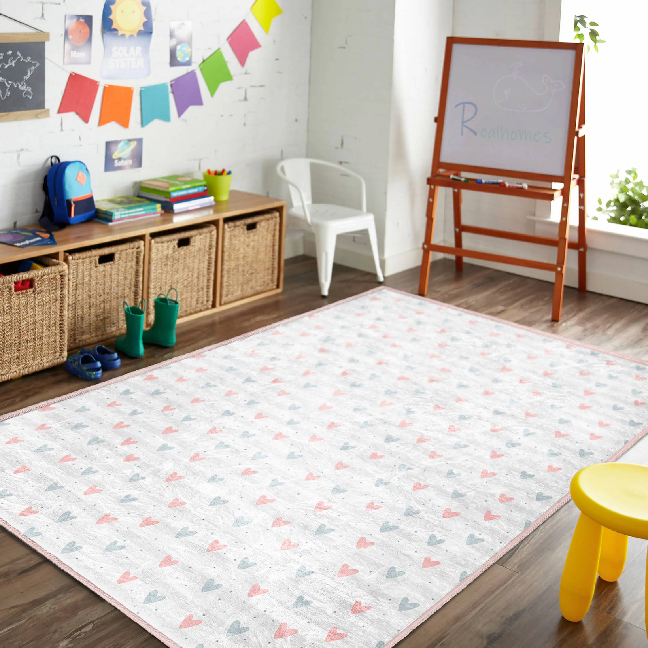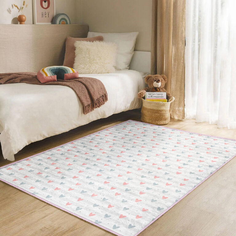 Pembe ve Mavi Kalp Desenli Yıkanabilir Kaymaz Taban Çocuk Halısı – Dikdörtgen Şekliyle İdeal