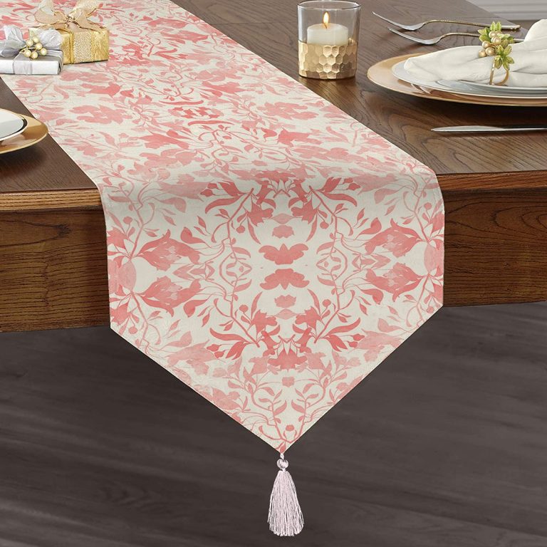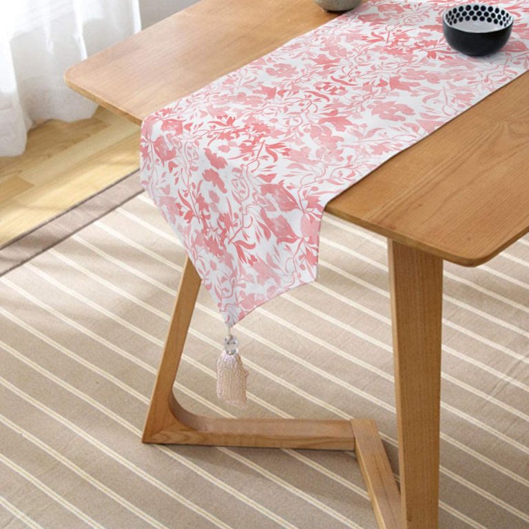 Pembe Yaprak Temalı Dijital Baskılı Püsküllü Şönil Üçgen Runner