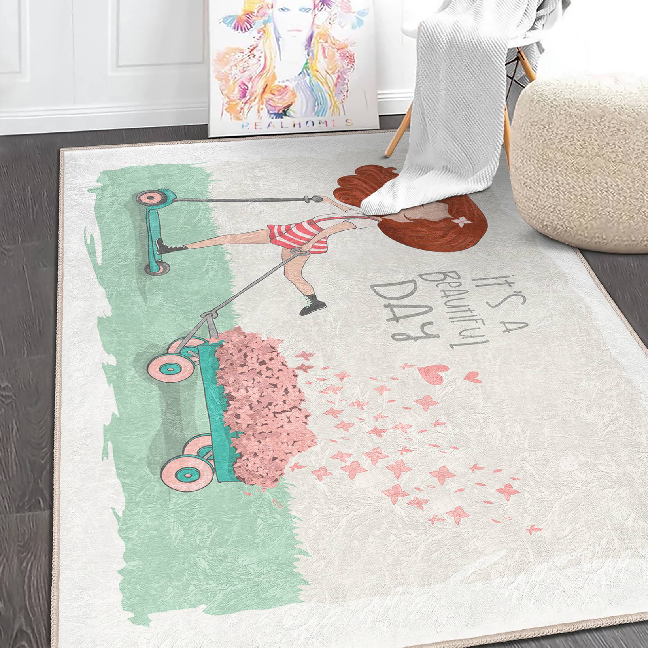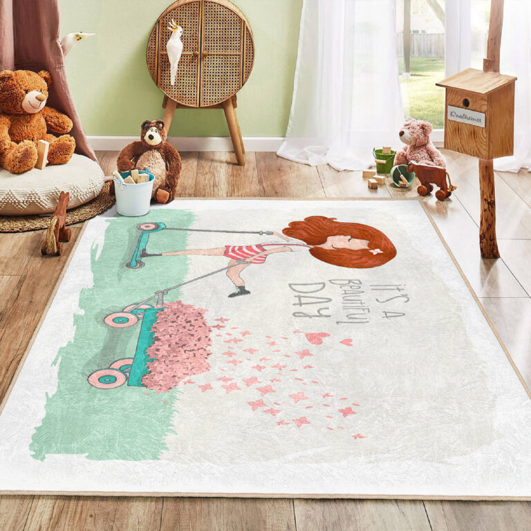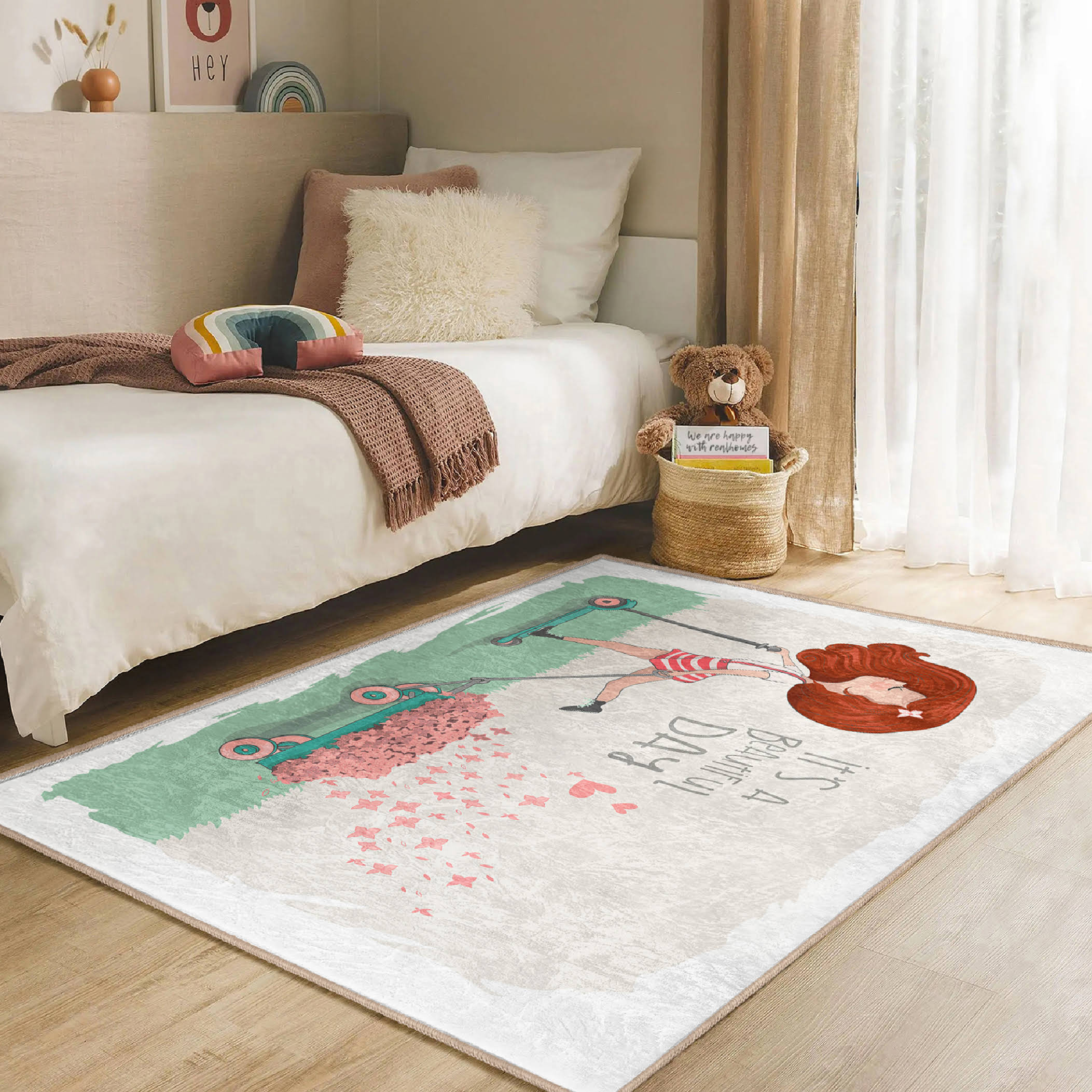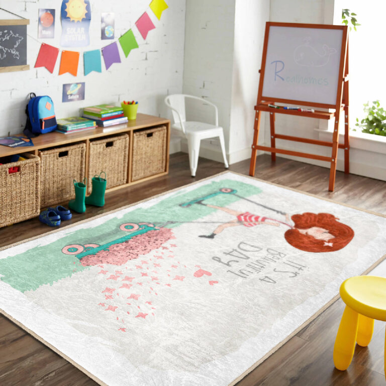 Pembe – Yeşil Arka Planda Renkli Kalp Motifli Çocuk Halısı – Makinede Yıkanabilir Kaymaz Taban