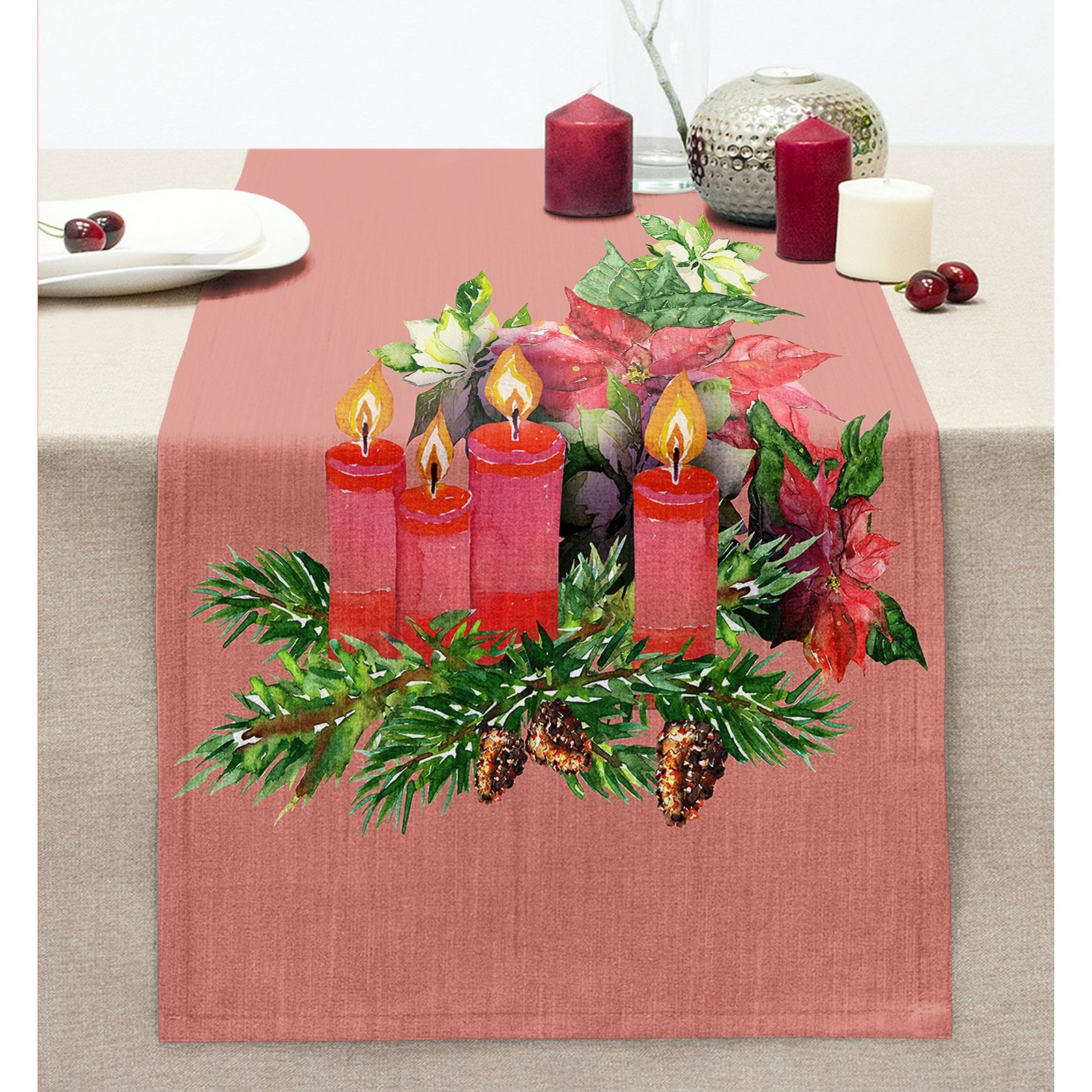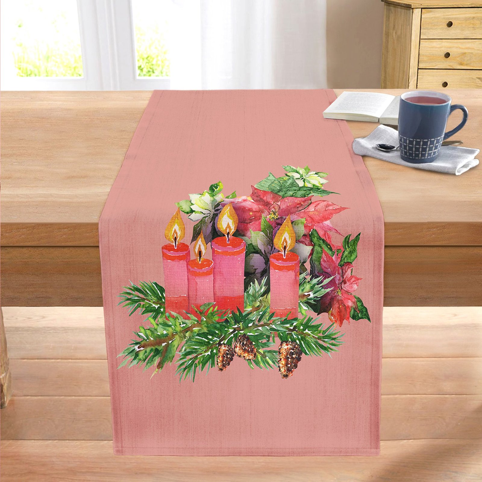 Pembe Zemin Çam Yapraklı Mum Tasarımlı Dijital Baskılı Modern Dikişli Şönil Runner