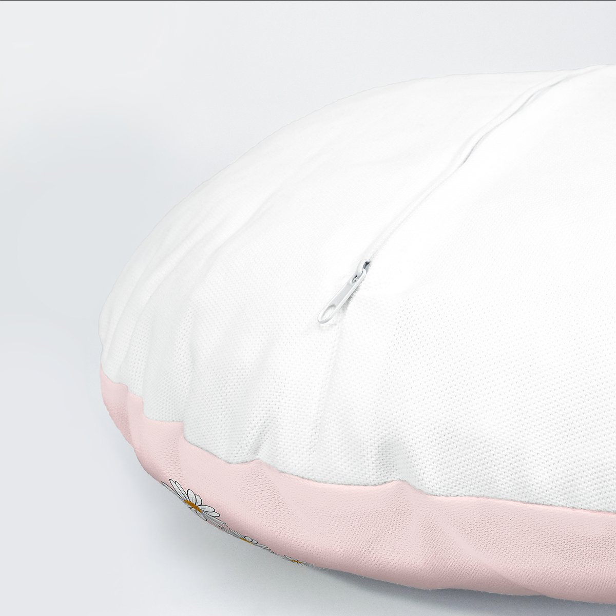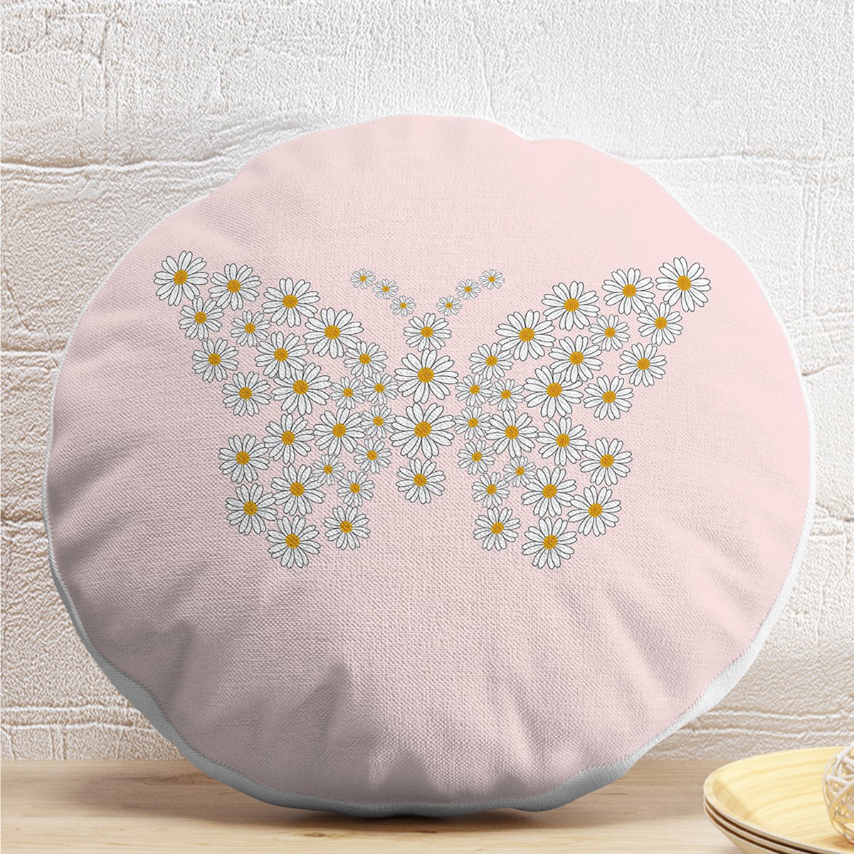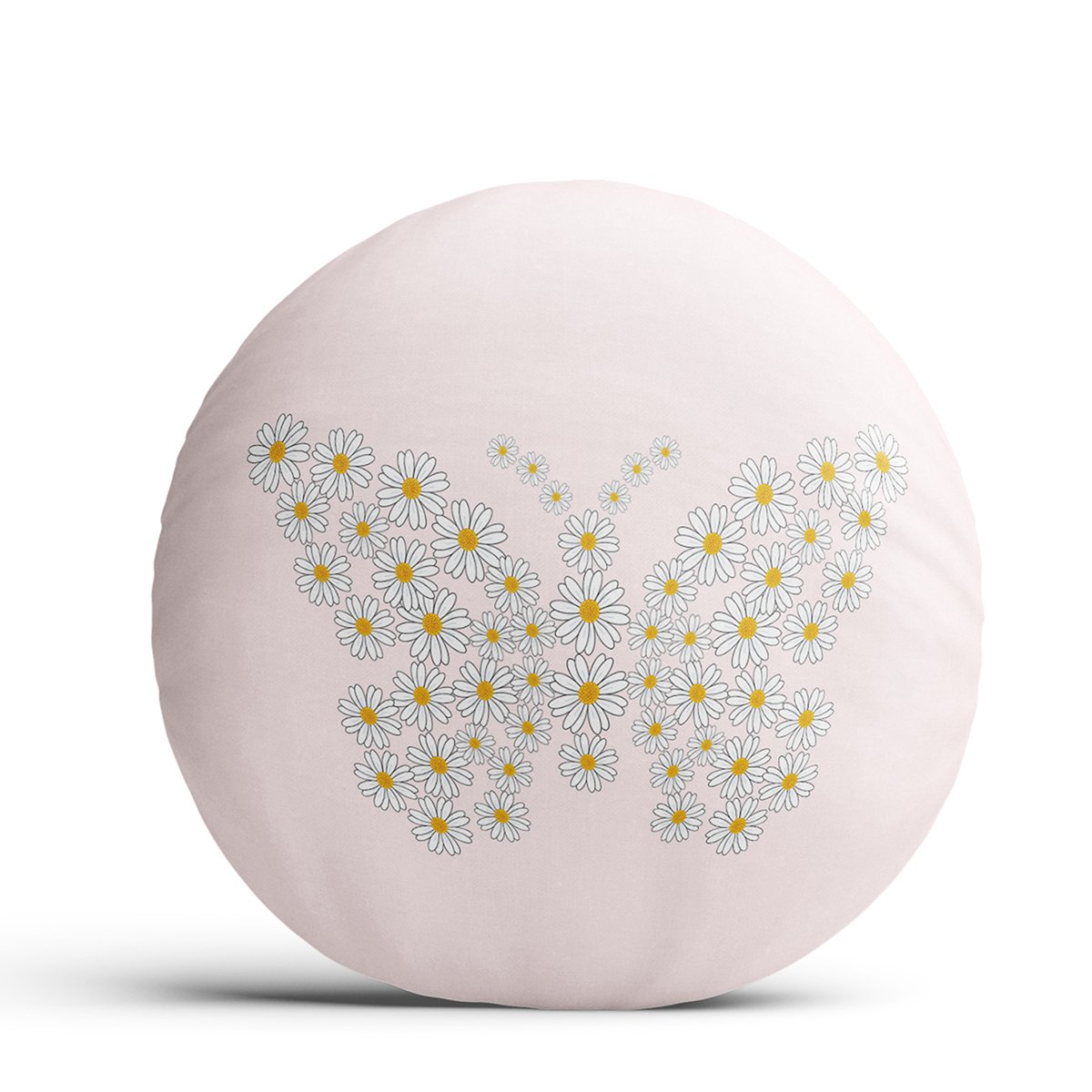 Pembe Zemin Papatyadan Kelebek Tasarımlı Dijital Baskılı Dekoratif Yuvarlak Yastık Kırlent Kılıfı