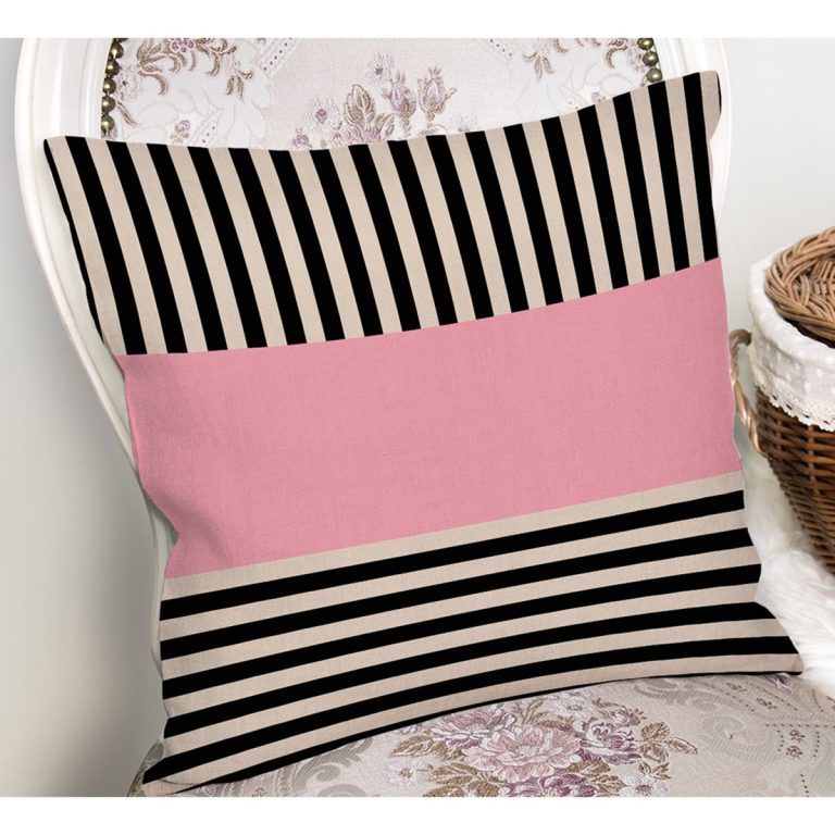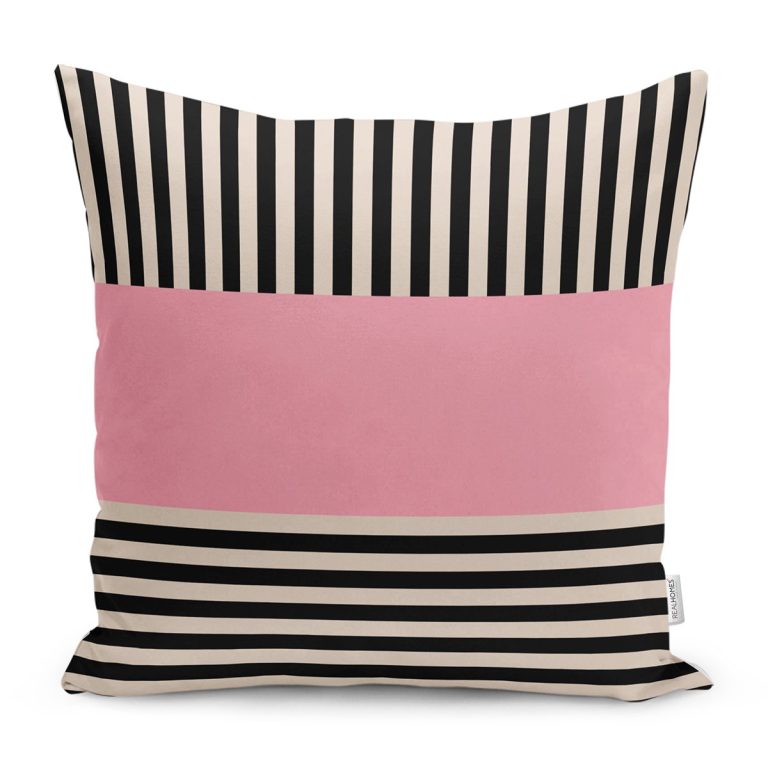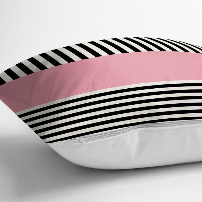 Pembe Zemin Siyah Çizgili Dijital Baskılı Modern Kırlent Kılıfı