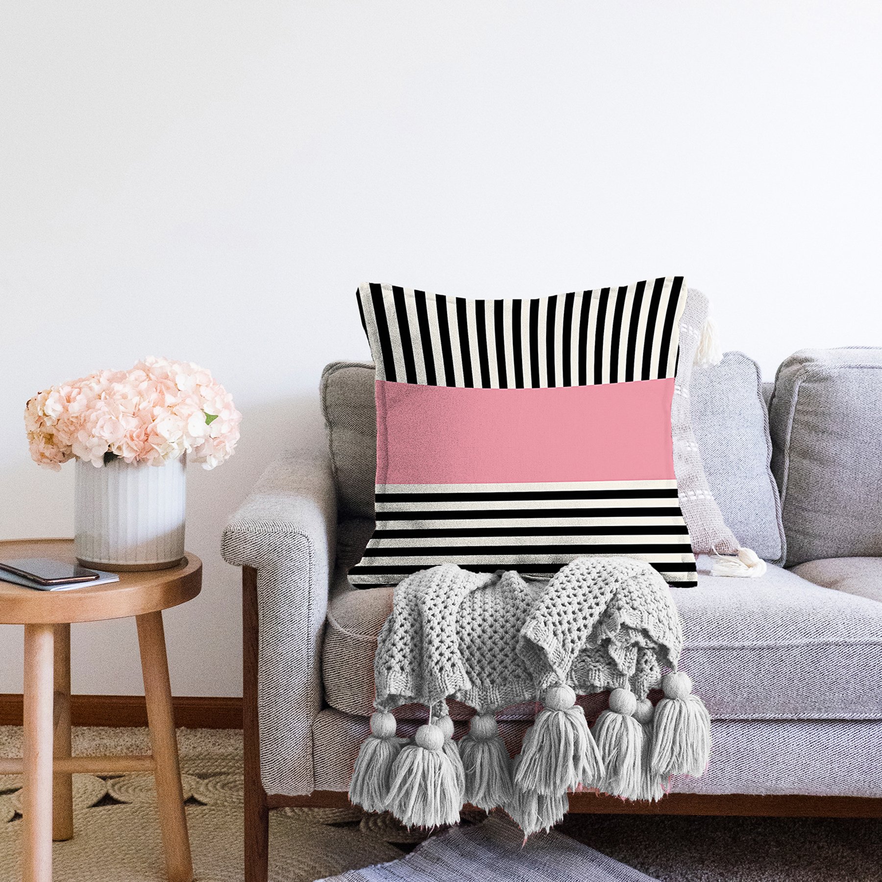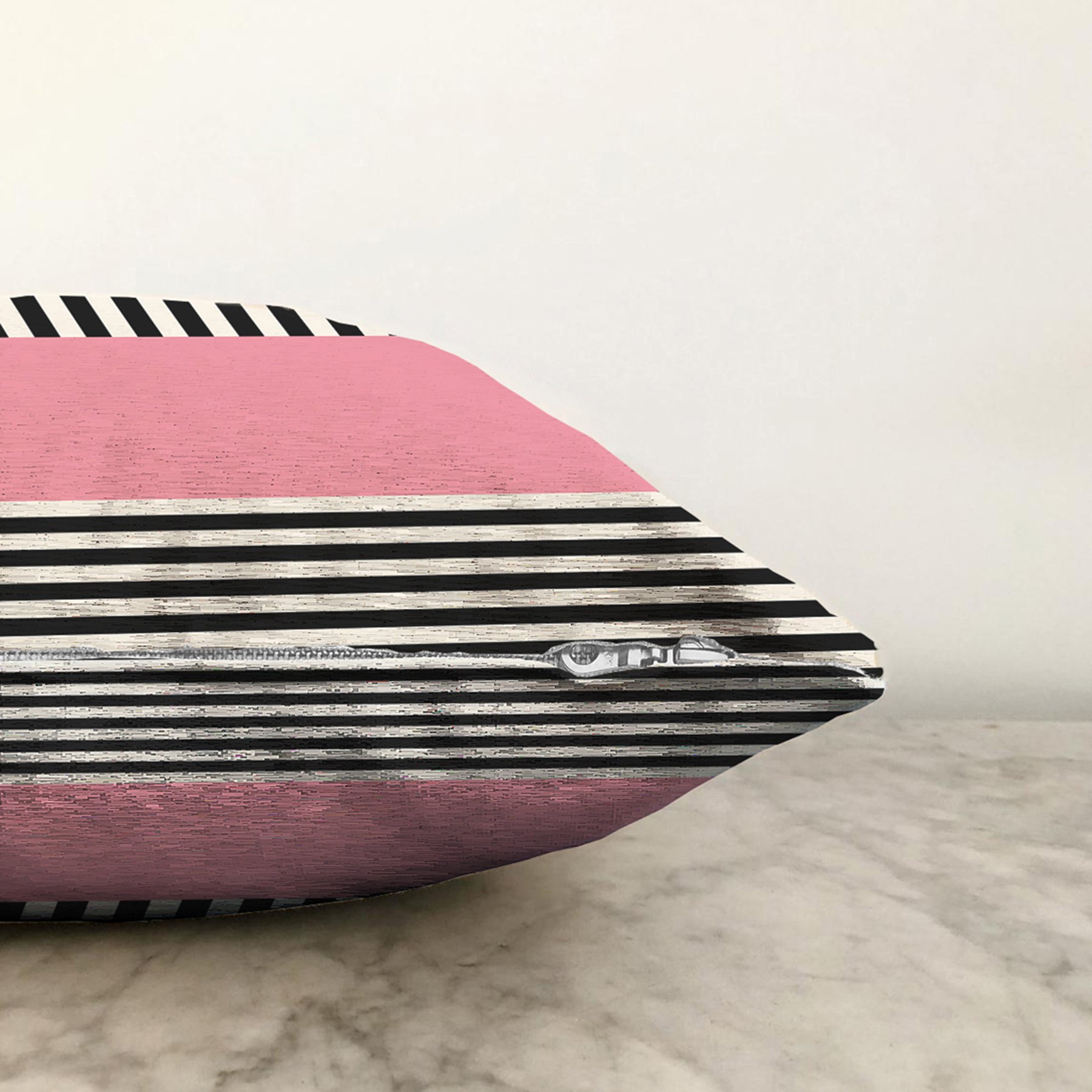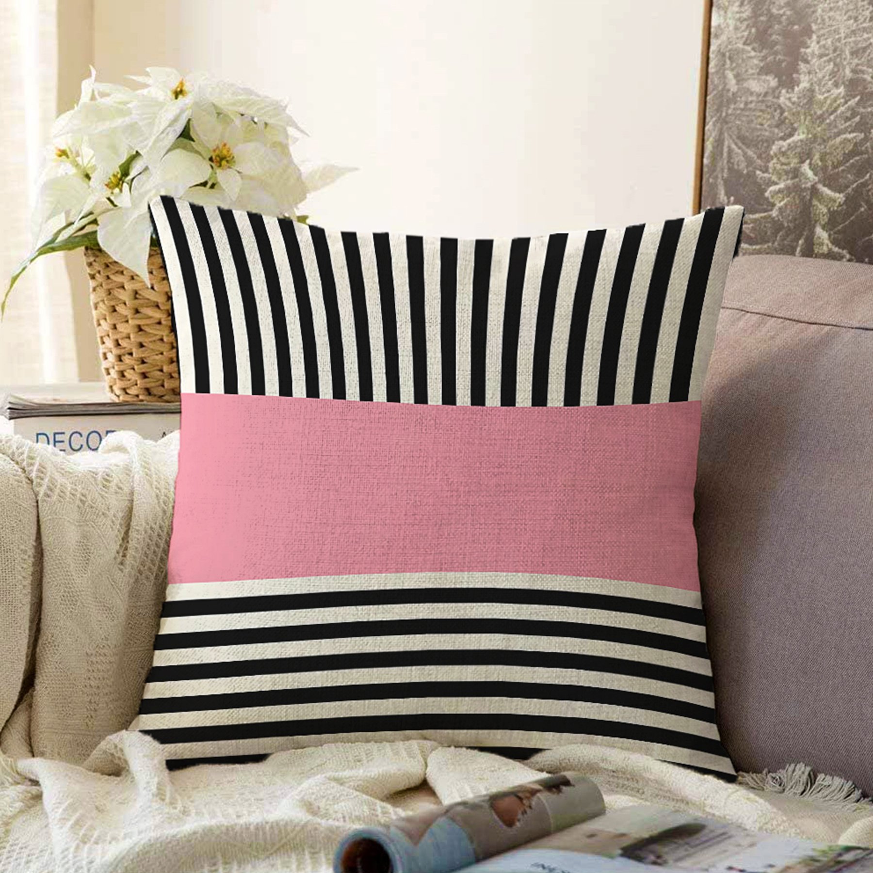 Pembe Zemin Siyah Çizgili Dijital Baskılı Modern Raşel Yastık Kırlent Kılıfı