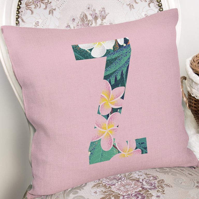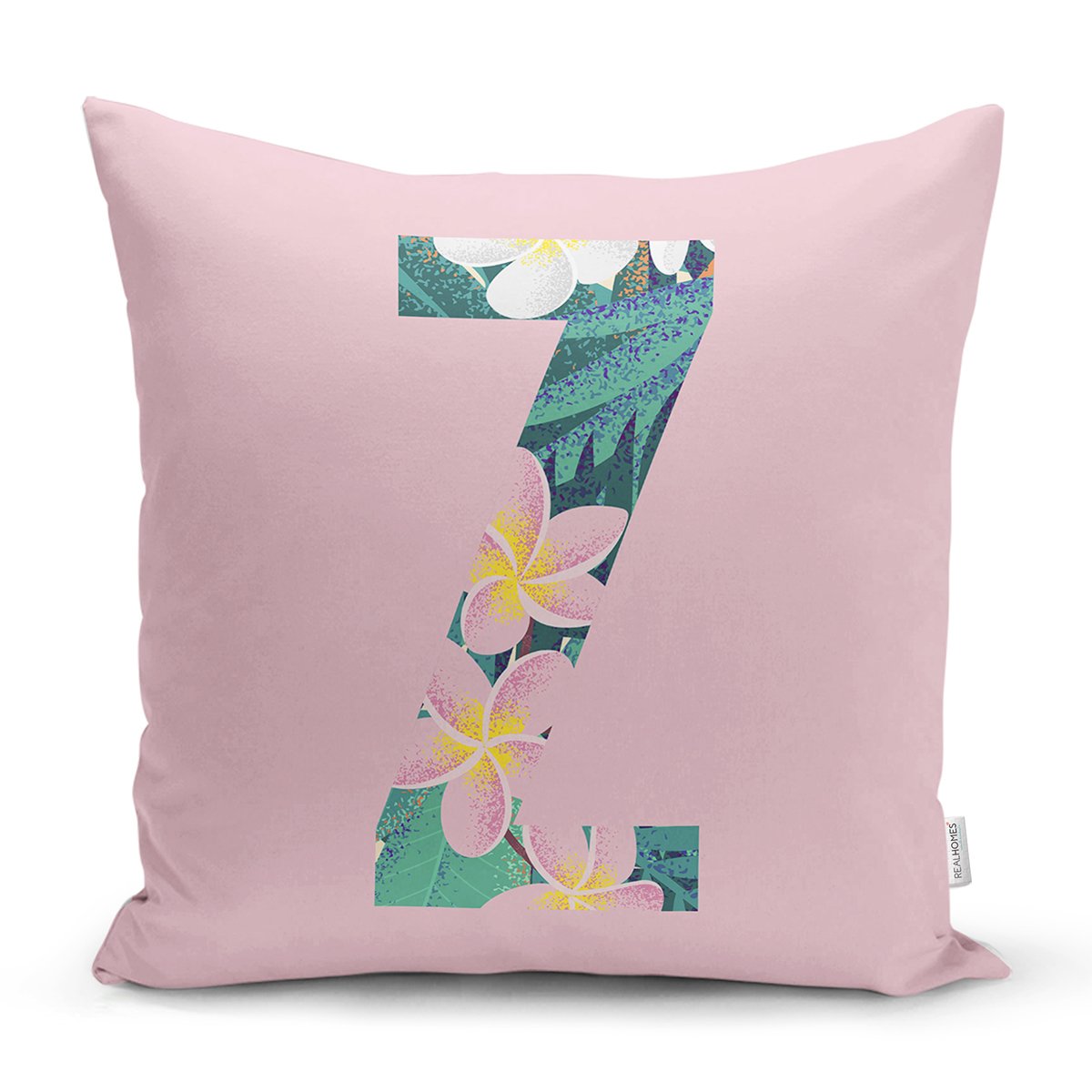 Pembe Zemin Tropik Yapraklı Z Harfi Özel Tasarım Dijital Baskılı Yastık Kırlent Kılıfı