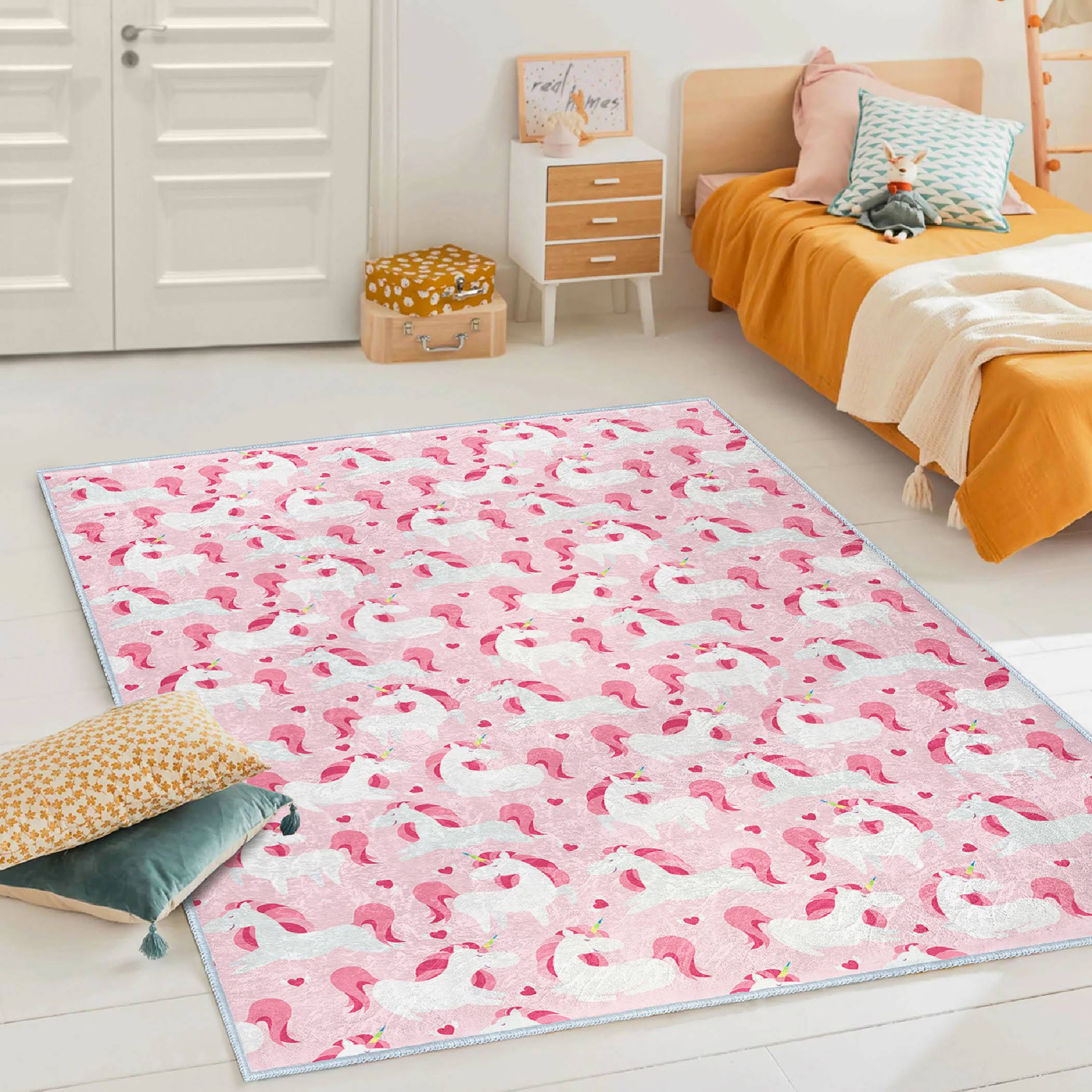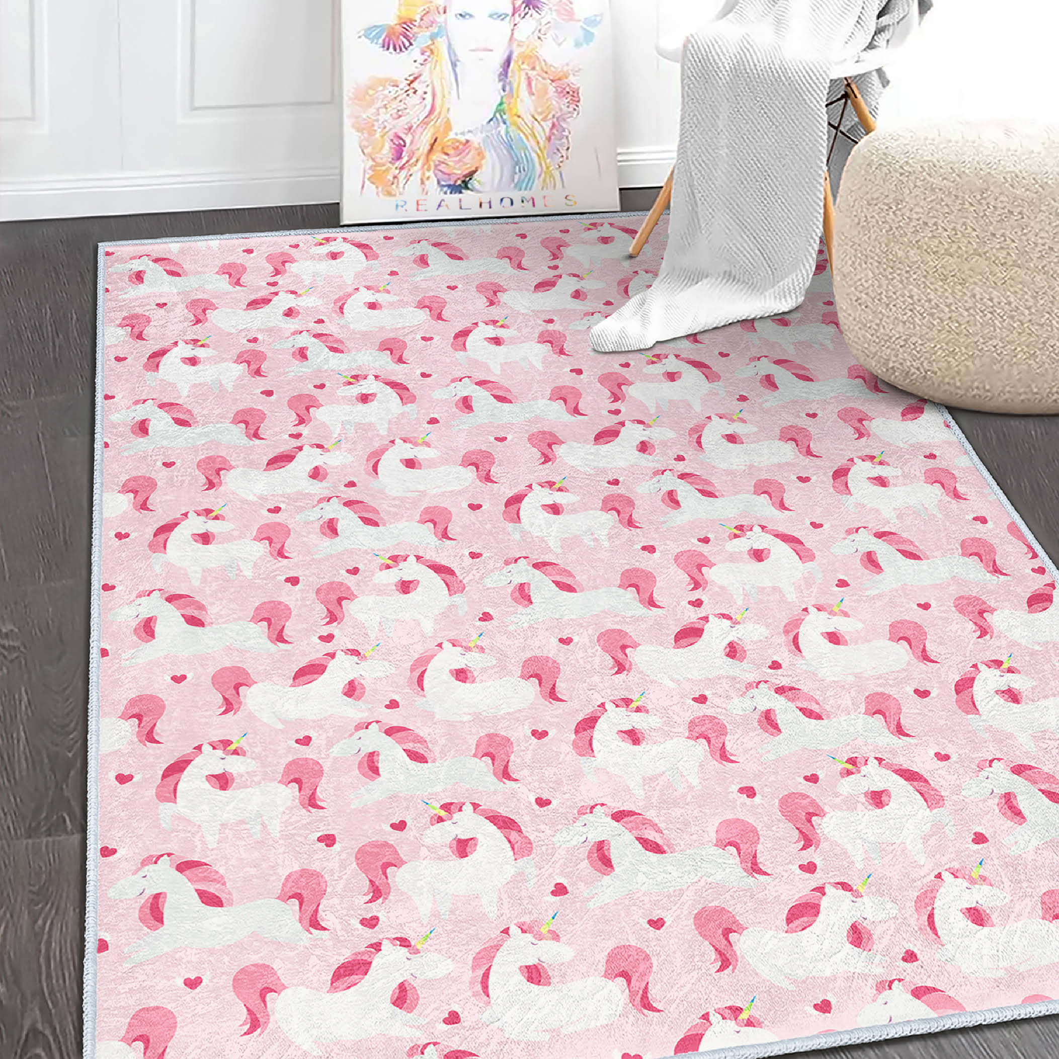 Pembe Zemin Üzerinde Sevimli Tekboynuz Desenli Çocuk Halısı, Makinede Yıkanabilir, Kaymaz Tabanlı