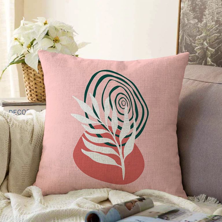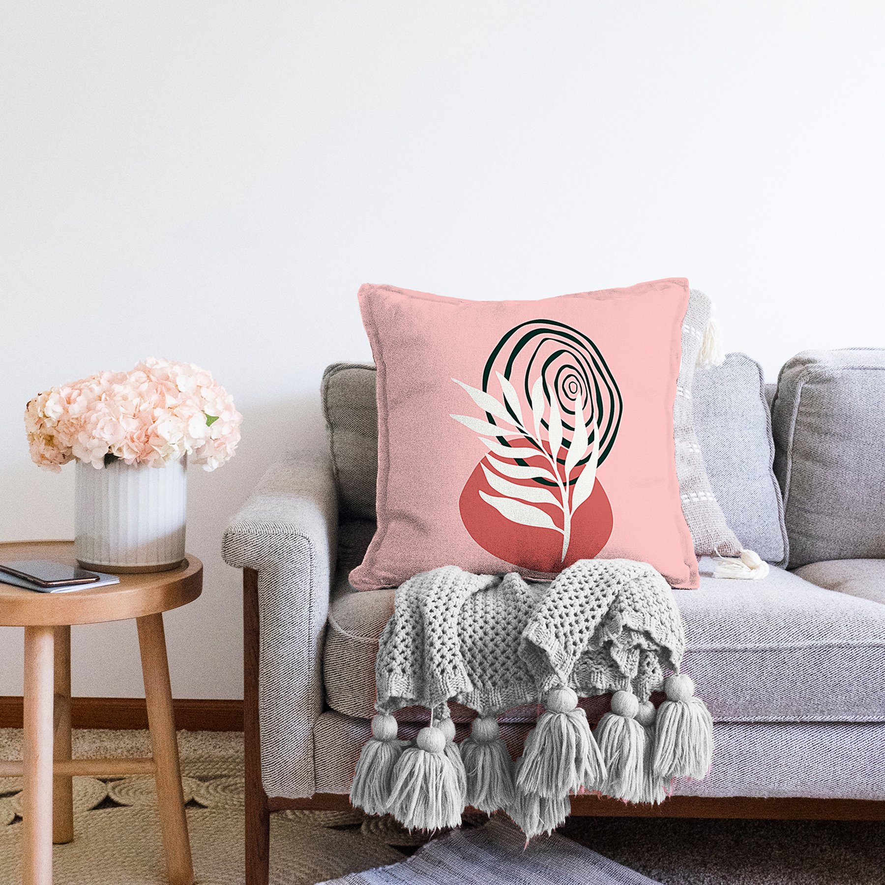 Pembe Zemin Yaprak Çizimli Onedraw Temalı Modern Raşel Yastık Kırlent Kılıfı