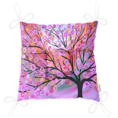 Pembe Zeminde Ağaç Ve Yaprak Desenli Dijital Baskılı Modern Pofidik Sandalye Minderi