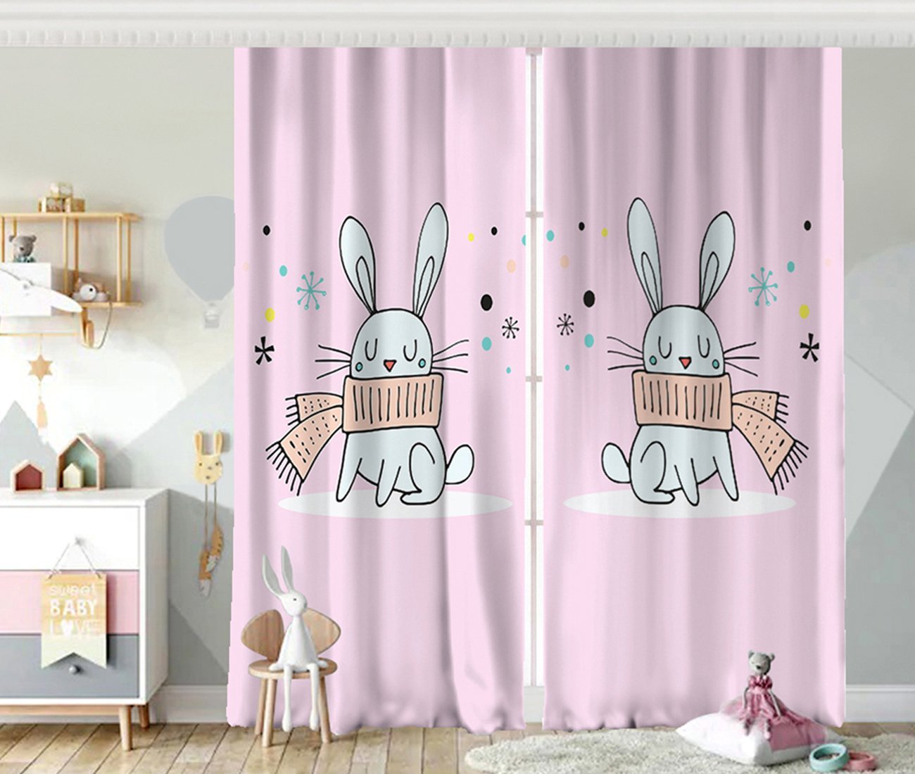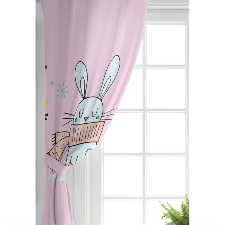 Pembe Zeminde Atkılı Tavşan Motifli Bebek Odası Fon Perde