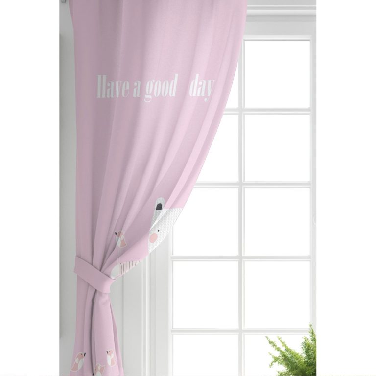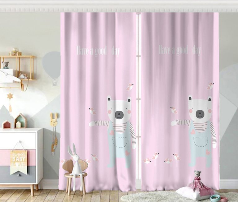 Pembe Zeminde Ayıcık Bebek Odası Fon Perde