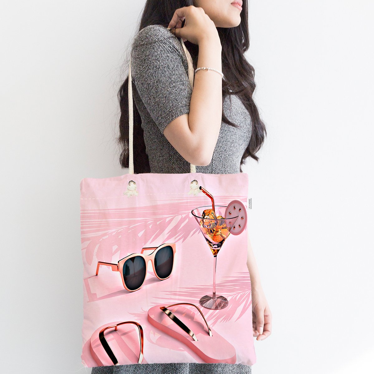 Pembe Zeminde Yaz Temalı Fermuarlı Omuz Çantası