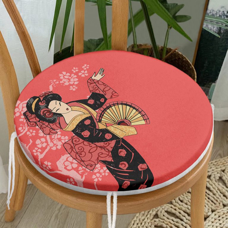 Prenses Pembe Zeminli Yelpazeli Kadın Desenli Yuvarlak Fermuarlı Sandalye Minderi