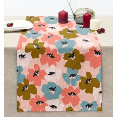 Pudra Zeminde Onedraw Çizimli Renkli Çiçek Desenli Dijital Baskılı Modern Dikişli Şönil Runner