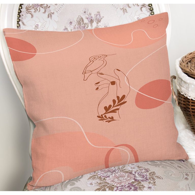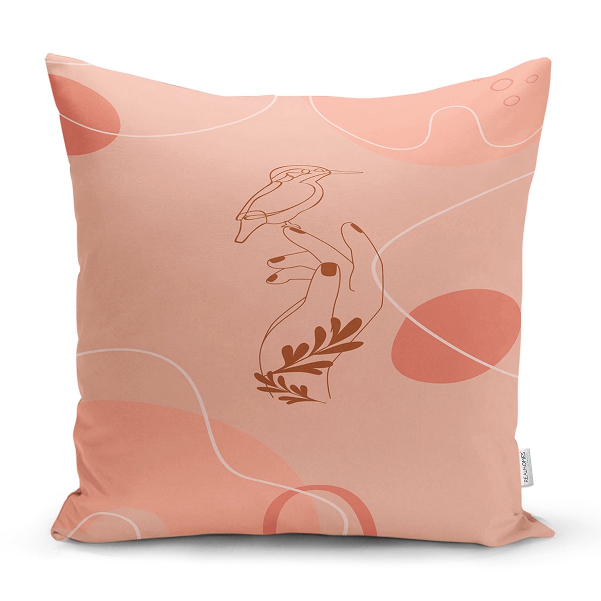Pudra Zeminde Onedraw Çizimli Yaprak Desenli Dijital Baskılı Modern Kırlent Kılıfı