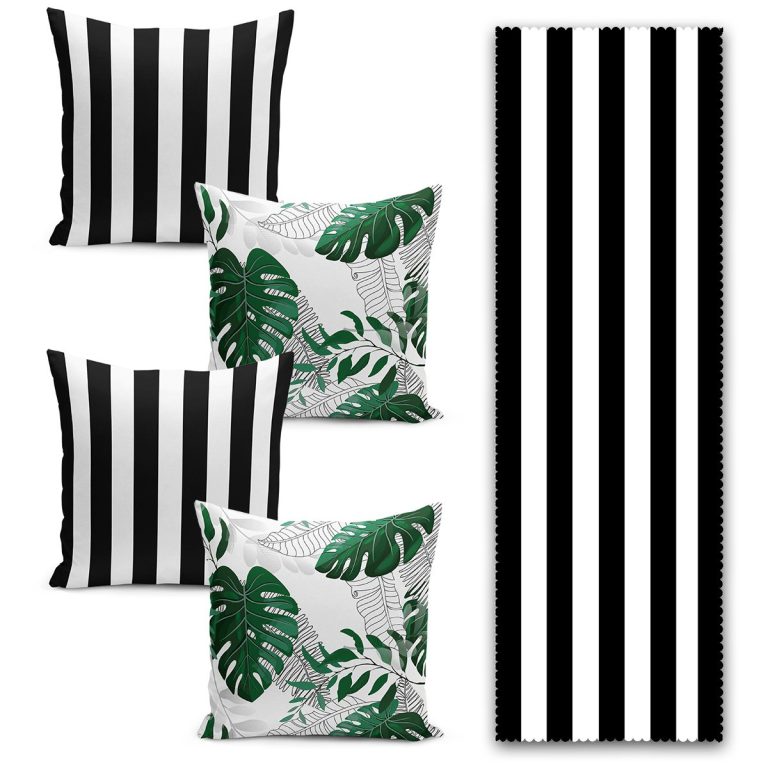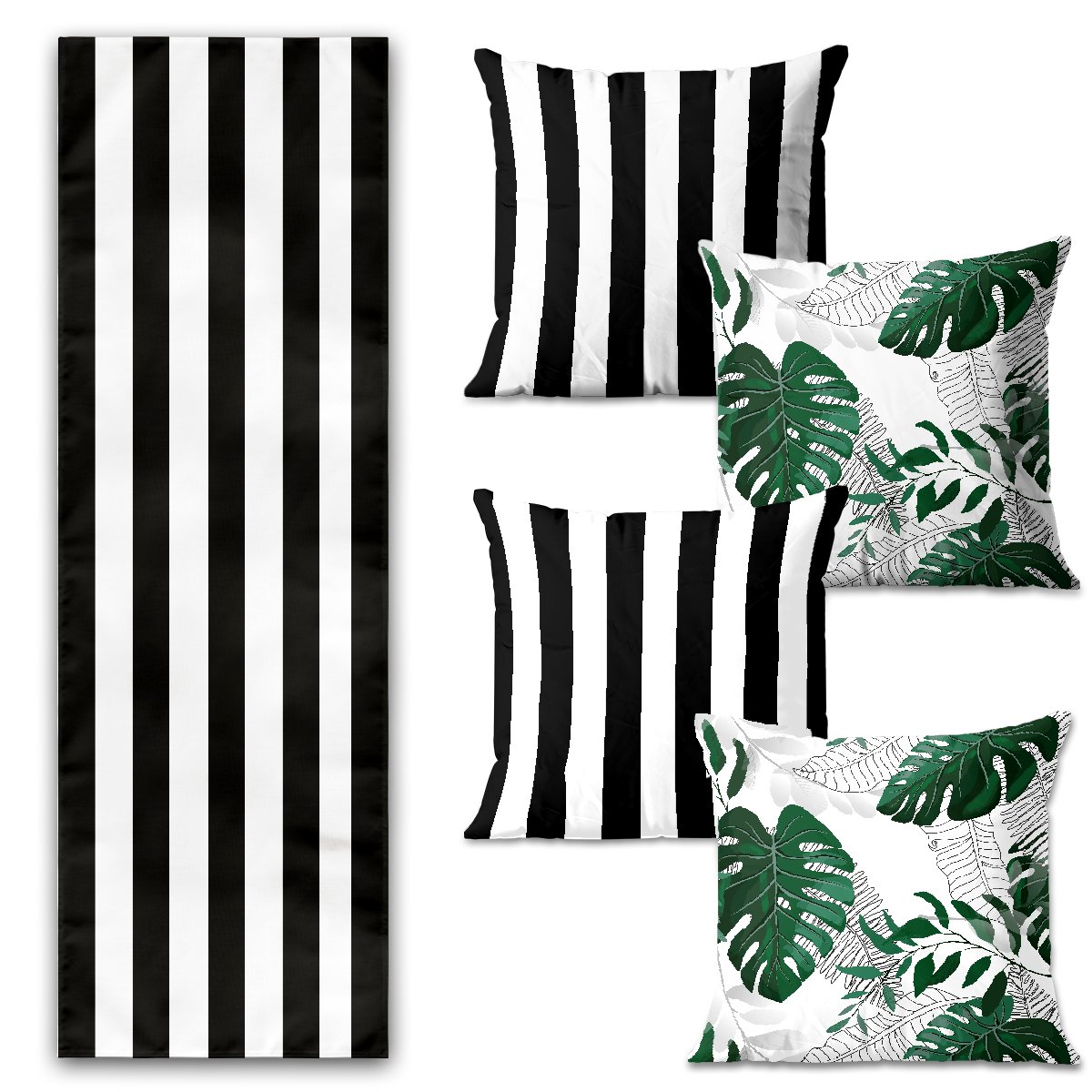 Realhomes 4+1 Siyah Beyaz Çizgili Dijital Baskılı Runner & Kırlent Kılıfı Seti