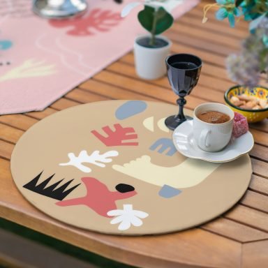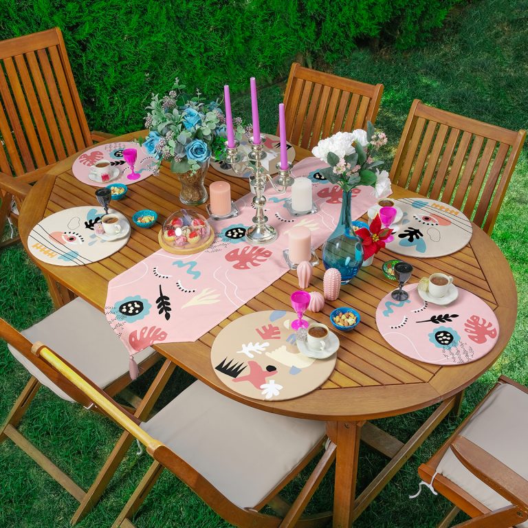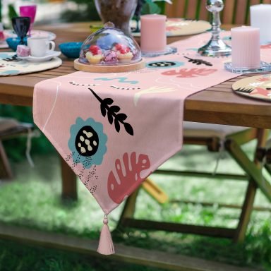 Realhomes 6+1 Renkli Çiçek Tasarımlı Onedraw Temalı Dekoratif Püsküllü Runner ve Yuvarlak Servis Altlığı & Supla Seti