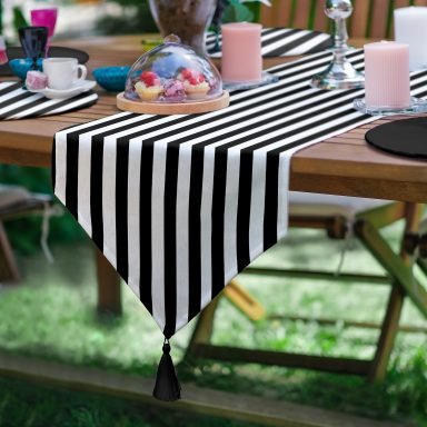 Realhomes 6+1 Siyah Beyaz Çizgili Düz Siyah Özel Tasarımlı Modern Püsküllü Runner ve Yuvarlak Servis Altlığı & Supla Seti
