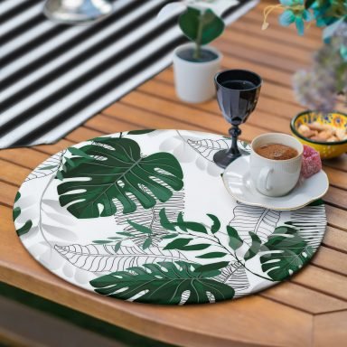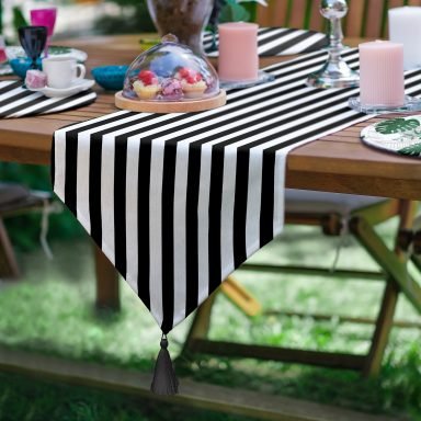 Realhomes 6+1 Siyah Beyaz Çizgili Tropik Yapraklar Özel Tasarım Modern Püsküllü Runner ve Yuvarlak Servis Altlığı & Supla Seti