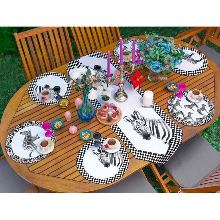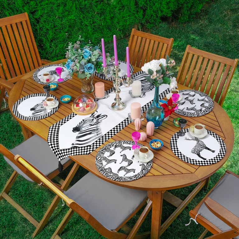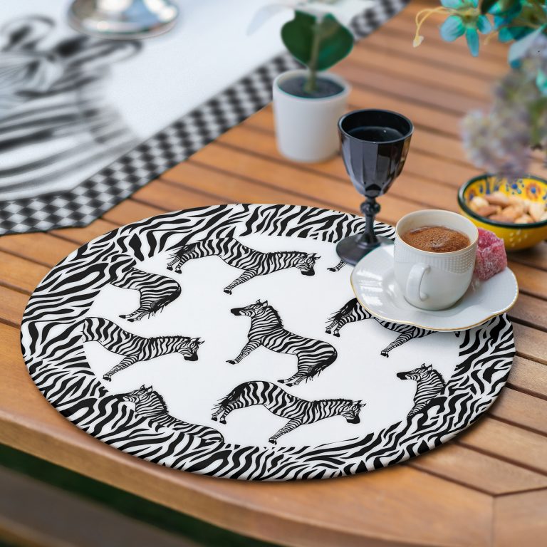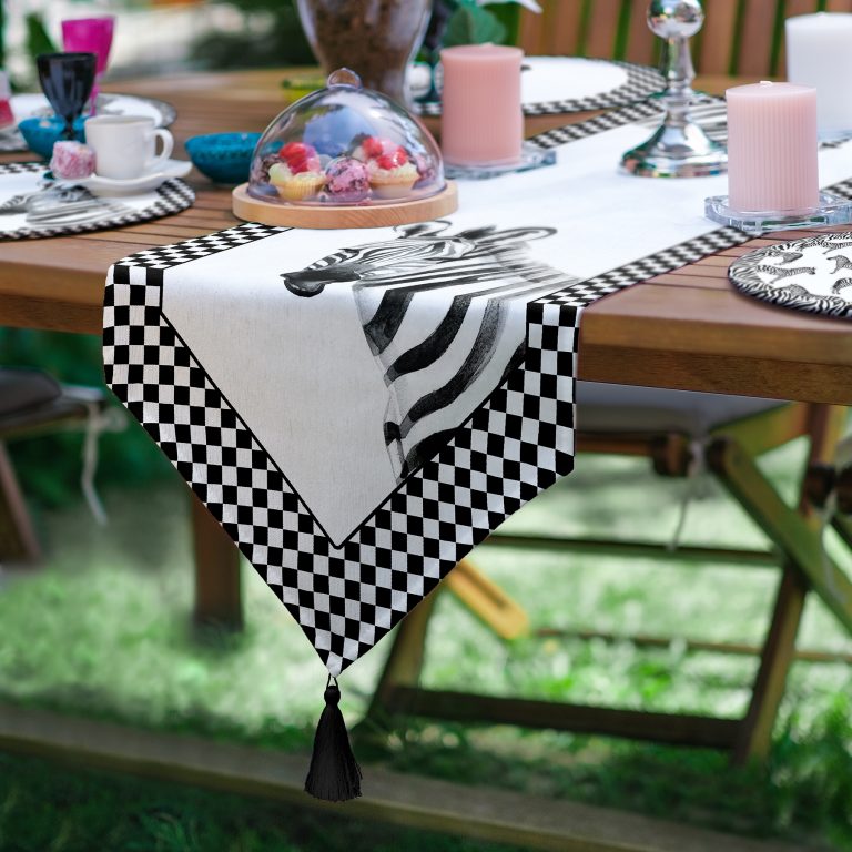 Realhomes 6+1 Siyah Beyaz Damalı Zebra ve Geyik Tasarımlı Dekoratif Püsküllü Runner ve Yuvarlak Servis Altlığı & Supla Seti
