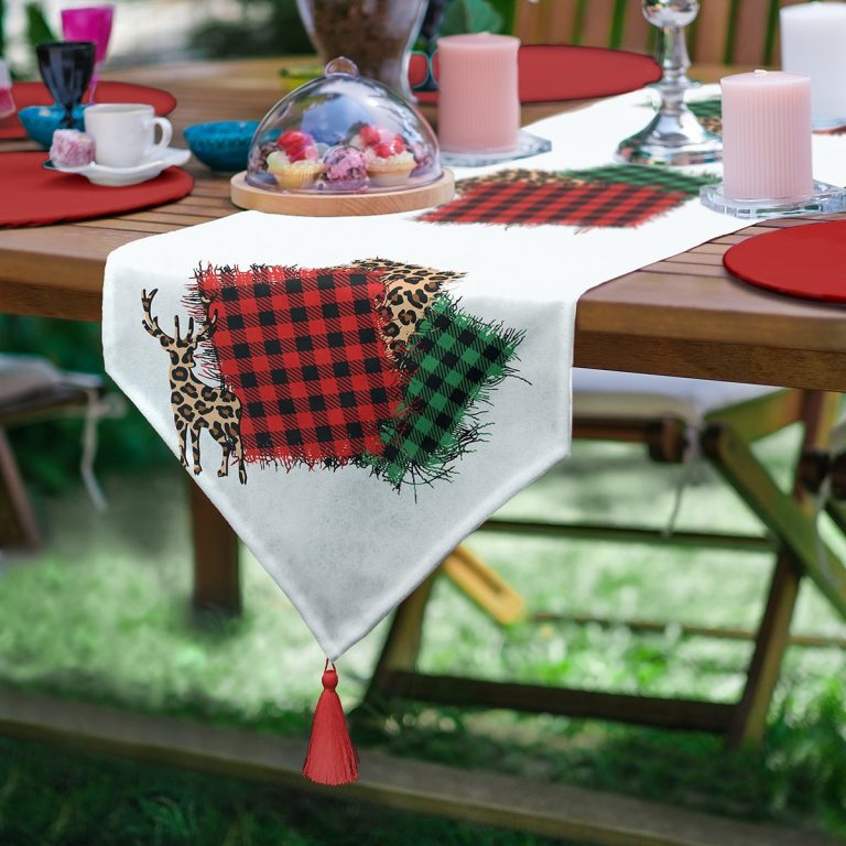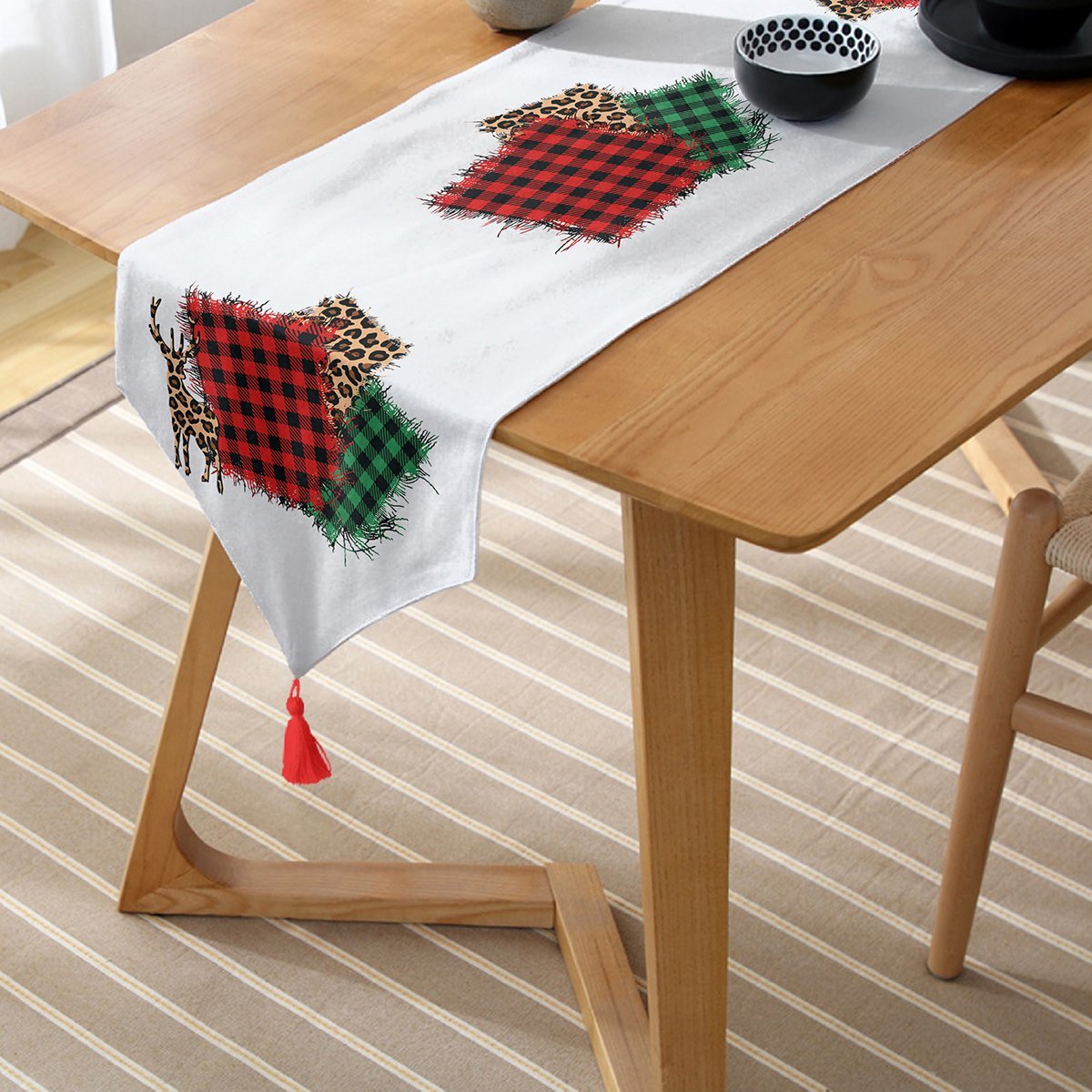 Realhomes Beyaz Zemin Üzerinde Ekoseli Kumaş Desenli Dijital Baskılı Özel Tasarım Püsküllü Şönil Üçgen Runner