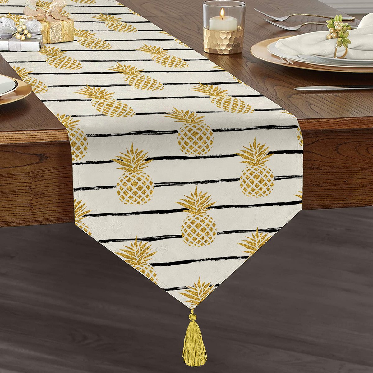 Realhomes Beyaz Zemin Üzerinde Gold Renkli Ananas Desenli Dijital Baskılı Özel Tasarım Püsküllü Şönil Üçgen Runner