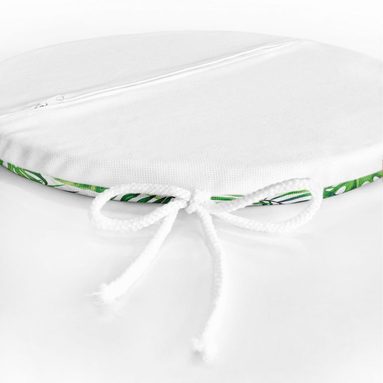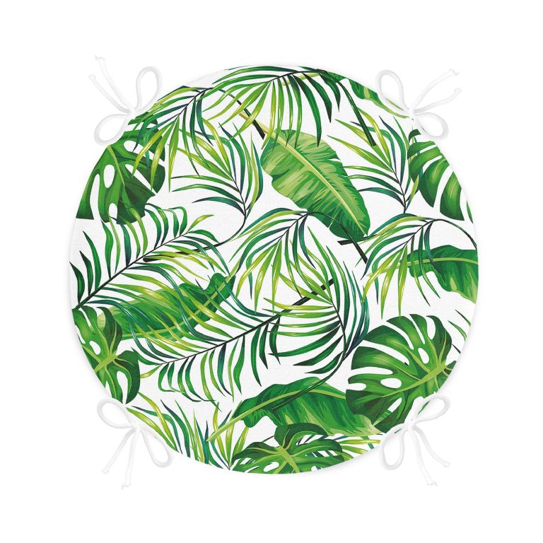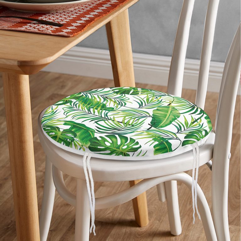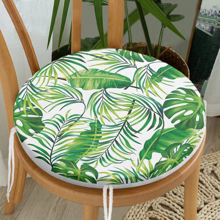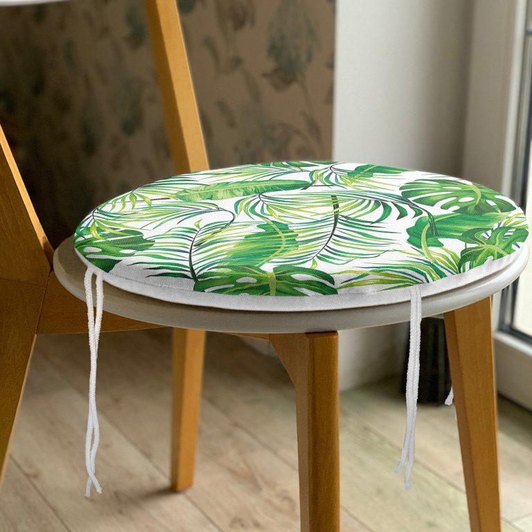 Realhomes Beyaz Zeminde Yeşil Yapraklar Tasarımlı Modern Yuvarlak Fermuarlı Sandalye Minderi