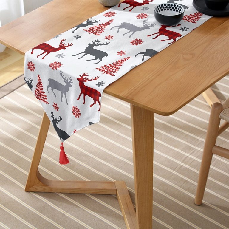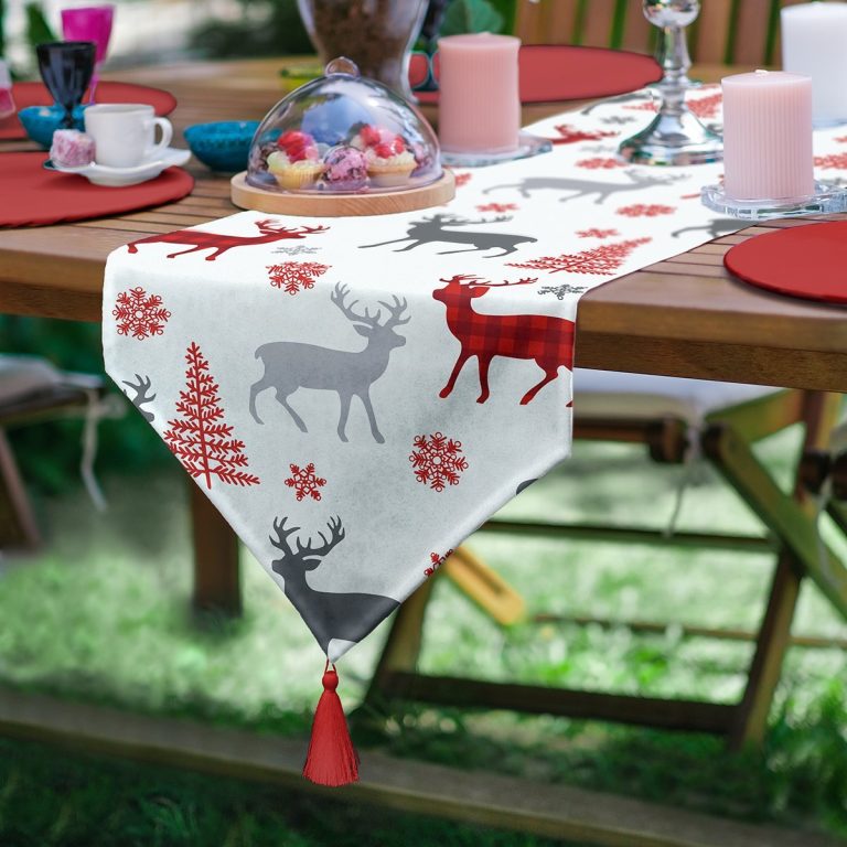 Realhomes Beyaz Zeminde Yılbaşı Motifleri Dijital Baskılı Özel Tasarım Püsküllü Şönil Üçgen Runner