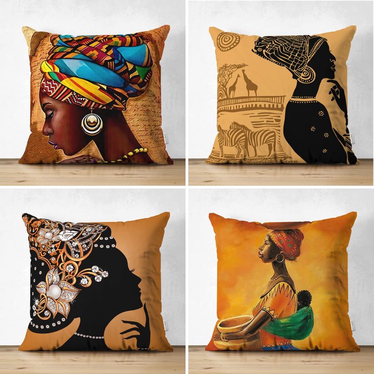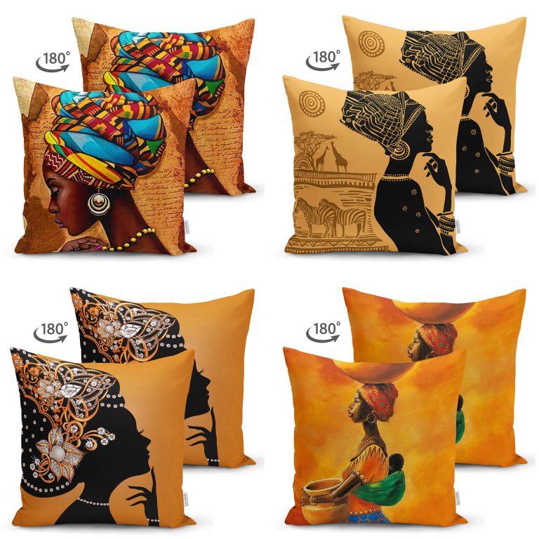 Realhomes Afrika Bayan Temalı Modern Dekoratif 4’lü Süet Yastık Kırlent Kılıf Seti