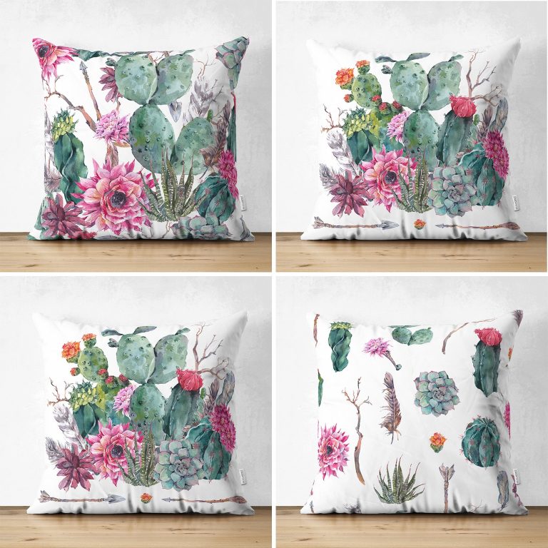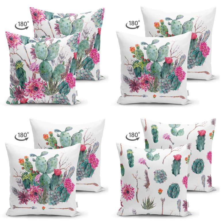 Realhomes Kaktüs Desen Motifli 4’lü Dekoratif Süet Yastık Kırlent Kılıf Seti