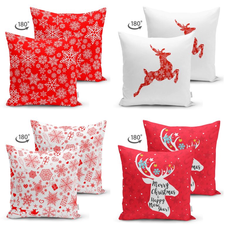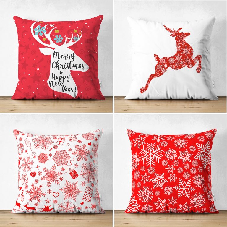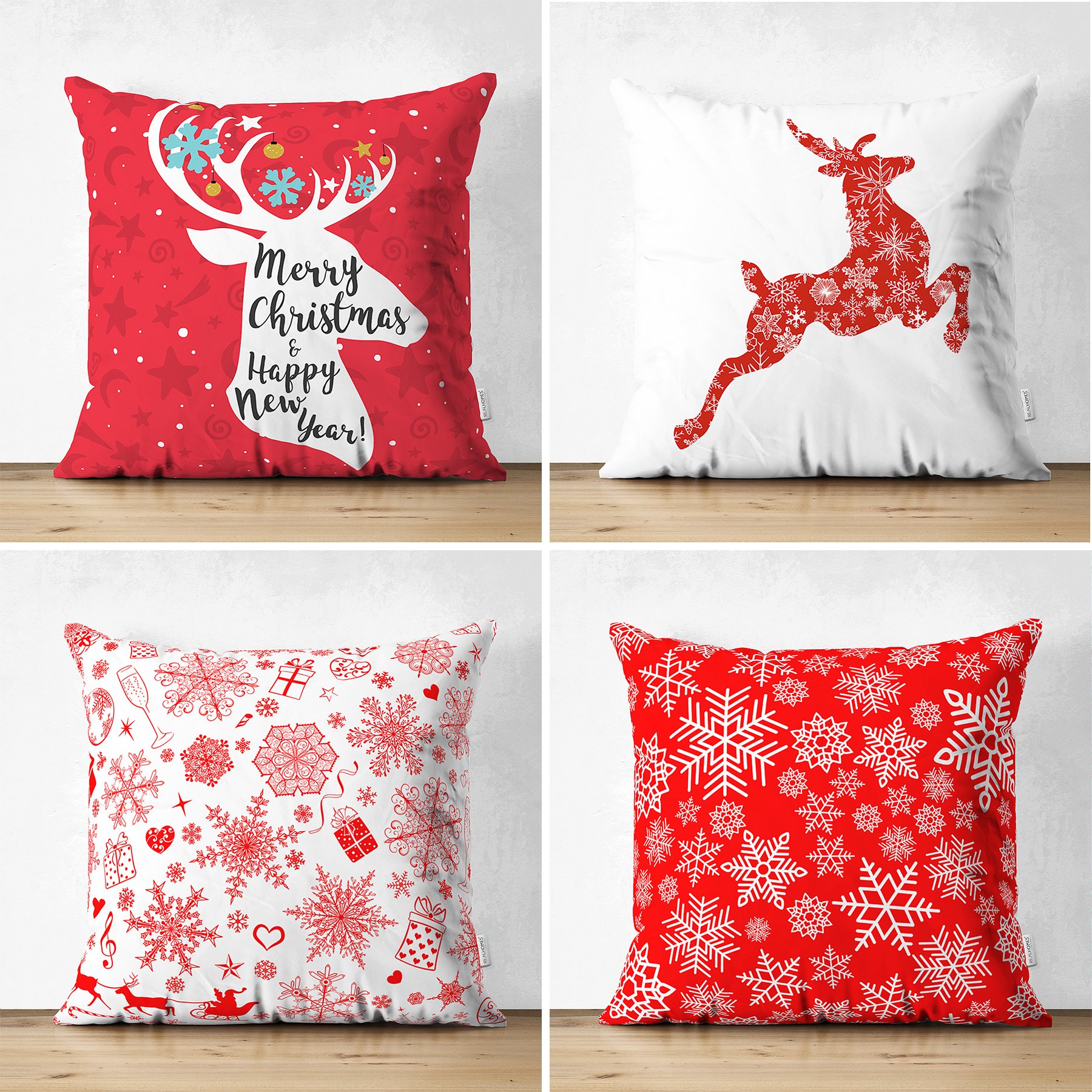 Realhomes Kırmızı Beyaz Yılbaşı Geyik ve Kar Taneleri 4’lü Süet Yastık Kılıf Seti