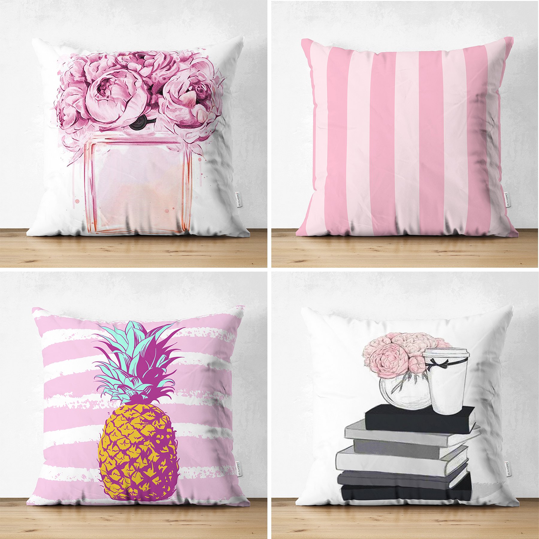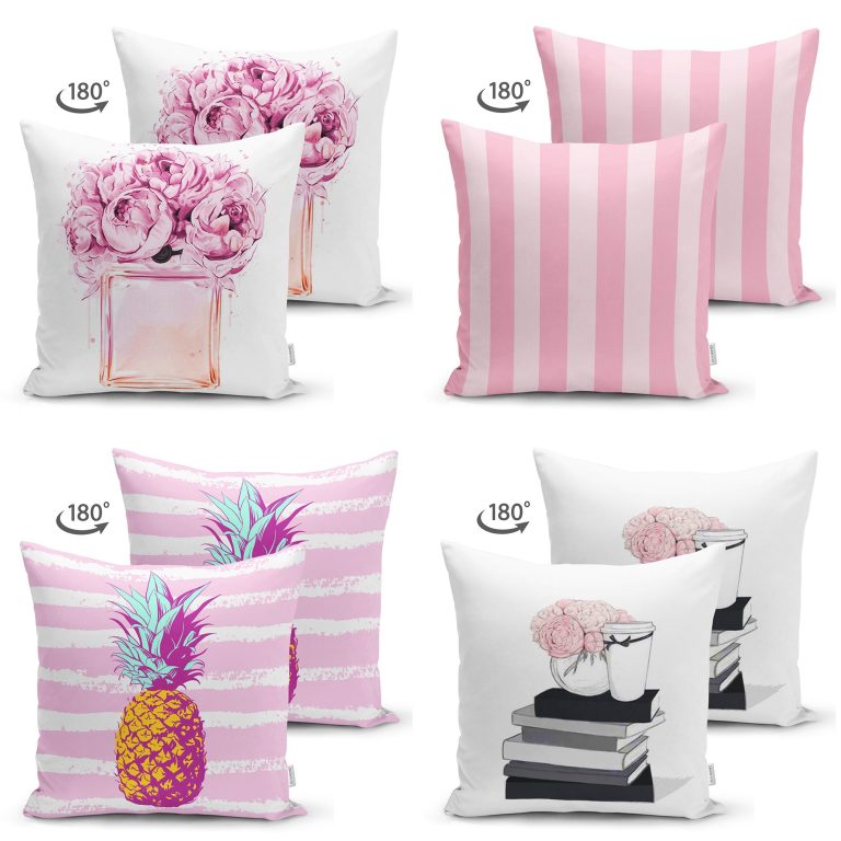 Realhomes Pembe Beyaz Çizgili Konsept 4’lü Modern Süet Yastık Kırlent Kılıf Seti