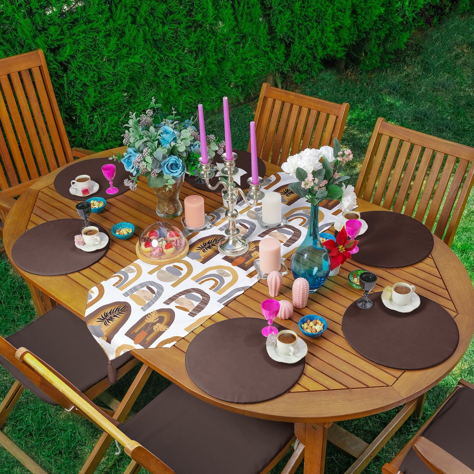 Realhomes Etnik Soyut Tasarımlı Püsküllü Runner & 6’lı Kahverengi Düz Renk Supla – Servis Altlığı