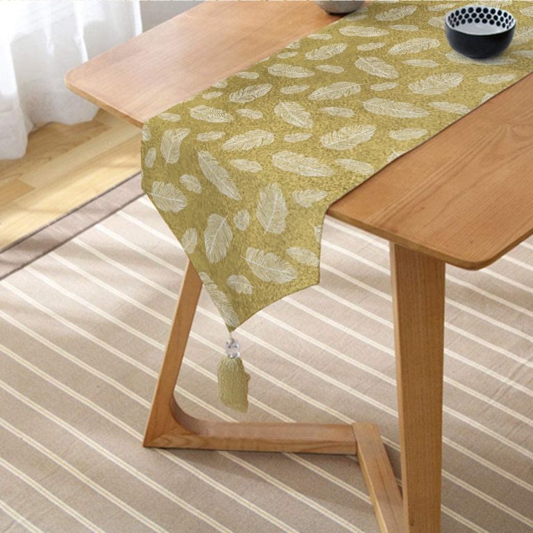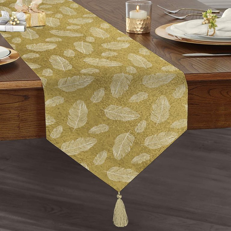 Realhomes Gold Zemin Üzerinde Beyaz Renkli Yaprak Desenli Dijital Baskılı Özel Tasarım Püsküllü Şönil Üçgen Runner