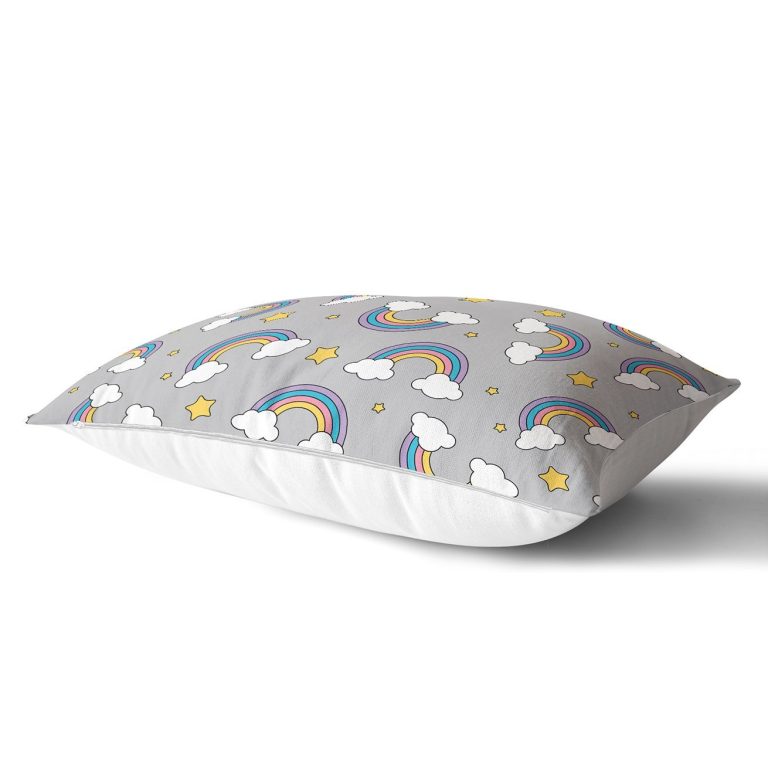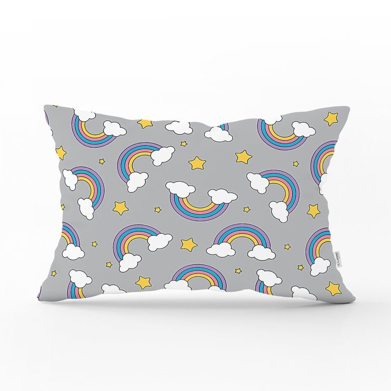 Realhomes Gri Zeminde Unicorn Gökkuşağı Dijital Baskılı Modern Dikdörtgen Kırlent Kılıfı