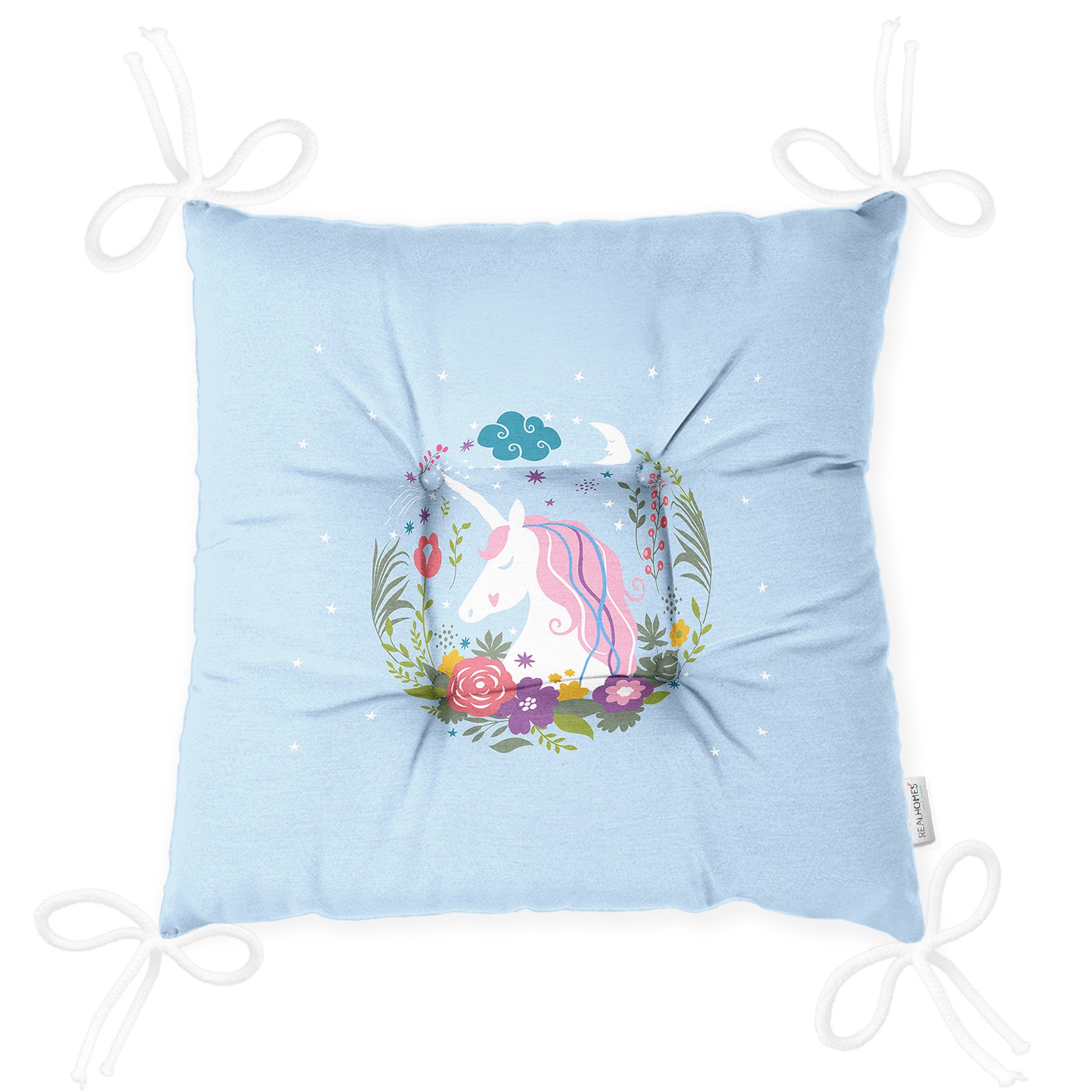 Realhomes Mavi Zeminde Unicorn At Desenli Modern Pofidik Sandalye Minderi