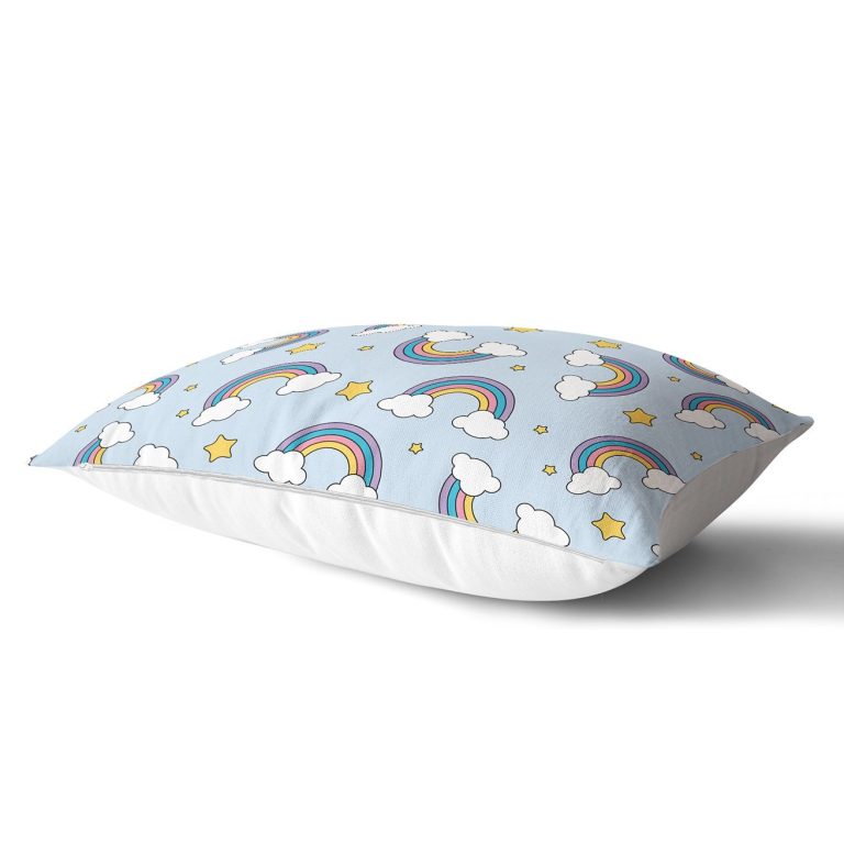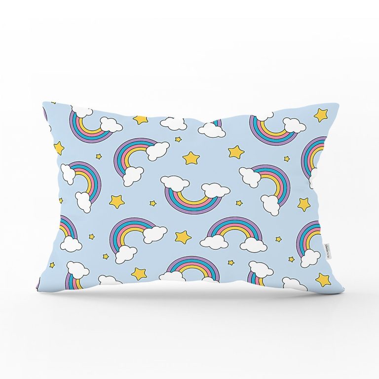Realhomes Mavi Zeminde Unicorn Gökkuşağı Dijital Baskılı Modern Dikdörtgen Kırlent Kılıfı
