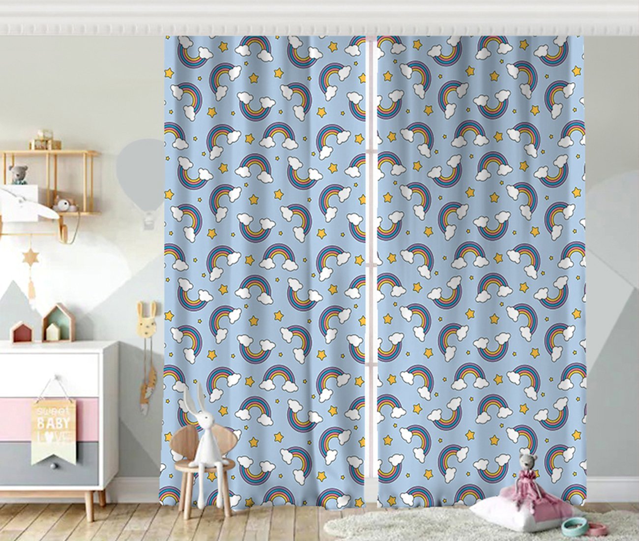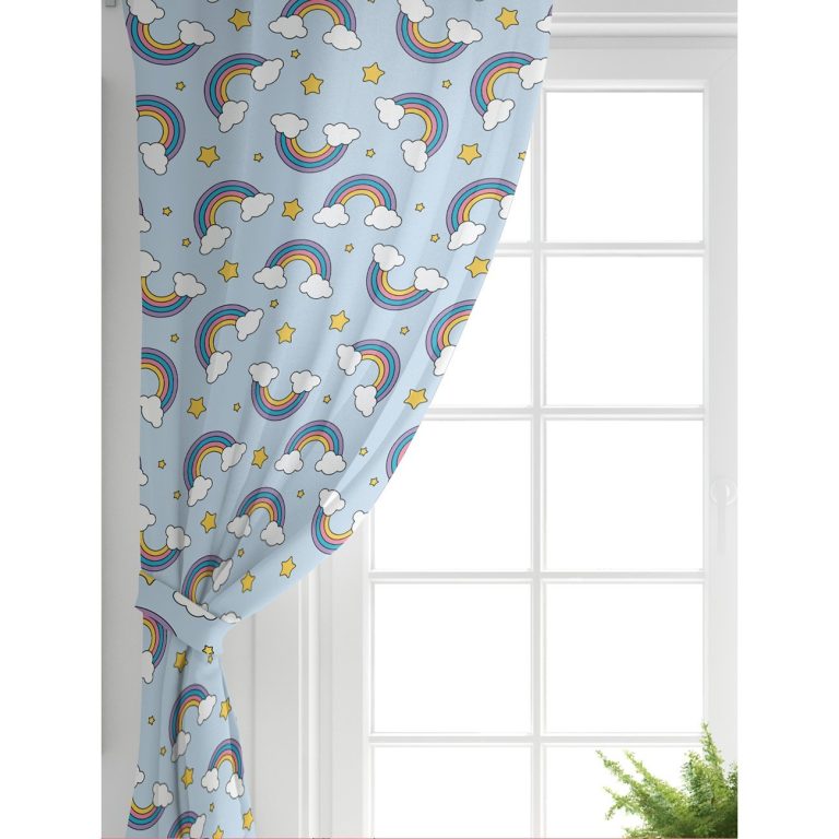 Realhomes Mavi Zeminde Unicorn Gökkuşağı Dijital Baskılı Modern Fon Perde