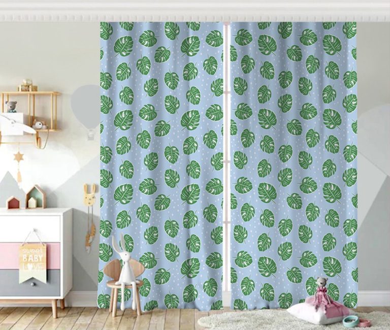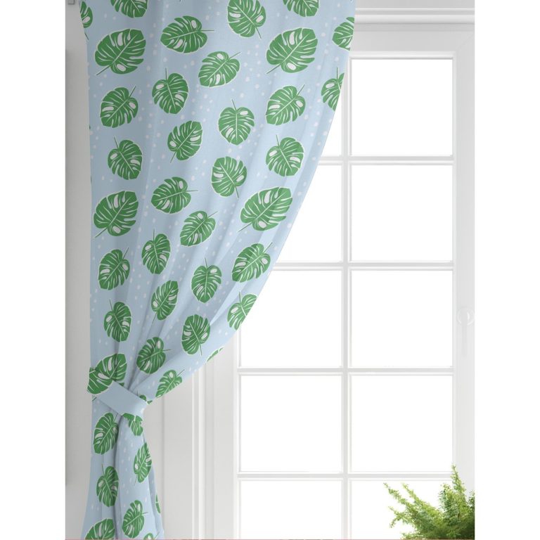 Realhomes Mavi Zeminde Yapraklar Dijital Baskılı Modern Fon Perde
