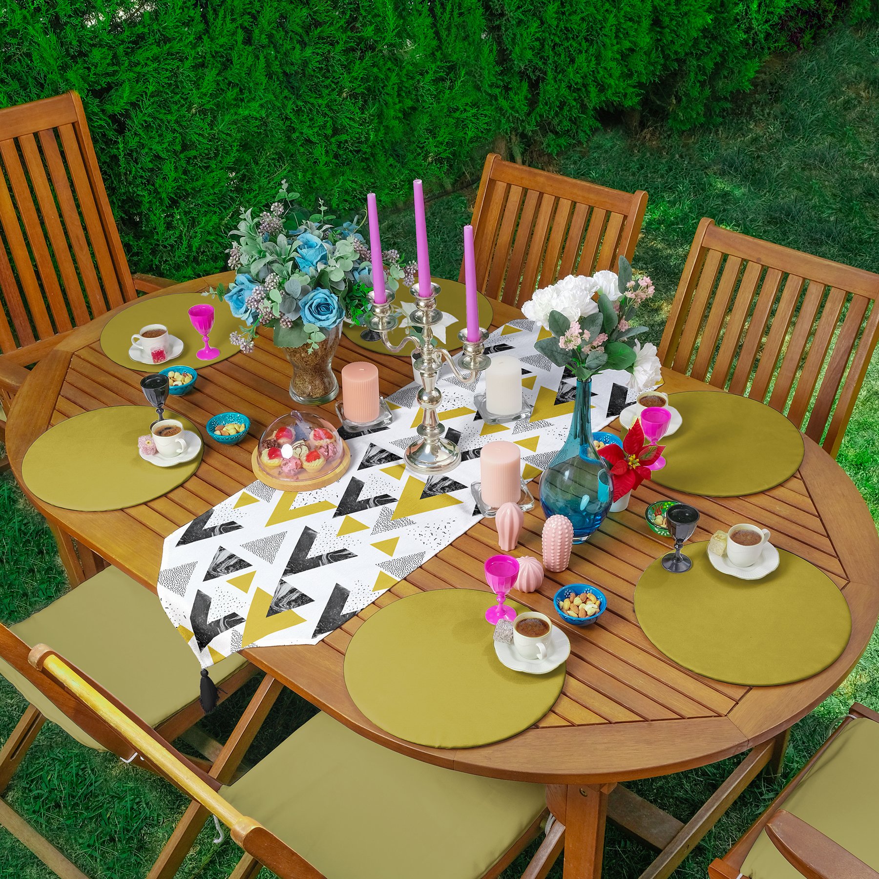 Realhomes Mermer Detaylı Siyah Beyaz Geometrik Motifli Püsküllü Runner & 6’lı Hardal Düz Renk Supla – Servis Altlığı